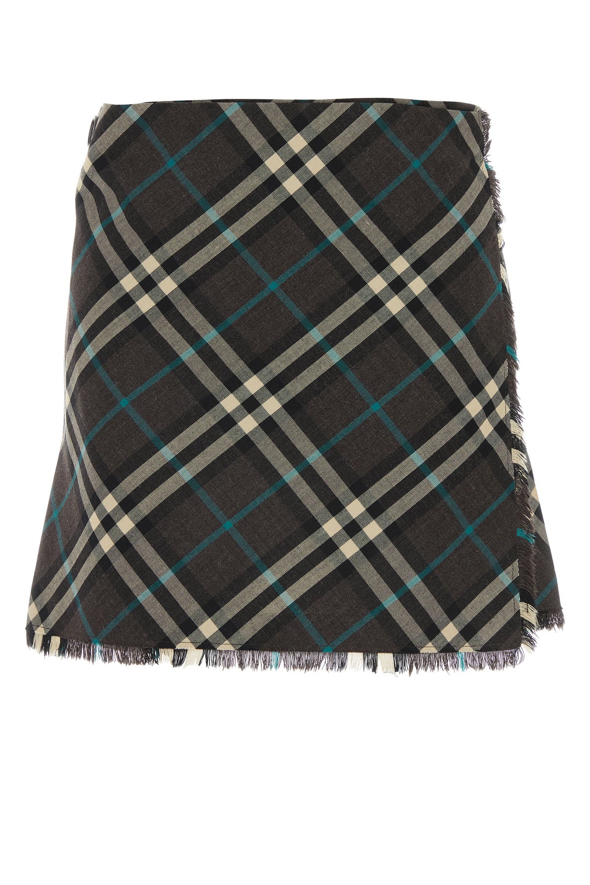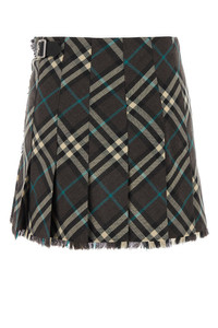 Mini skirt realized in polyester blend characterized by Burberry Check embroidery on the entire surface. - Wrap closure by strap at the waist - Fringed trimmings - Unlined DETAILS Embroidered polyester blend mini skirt Exterior: 55% Polyester 45% Wool Made in scotland Model is 175 cm and is wearing a size 6