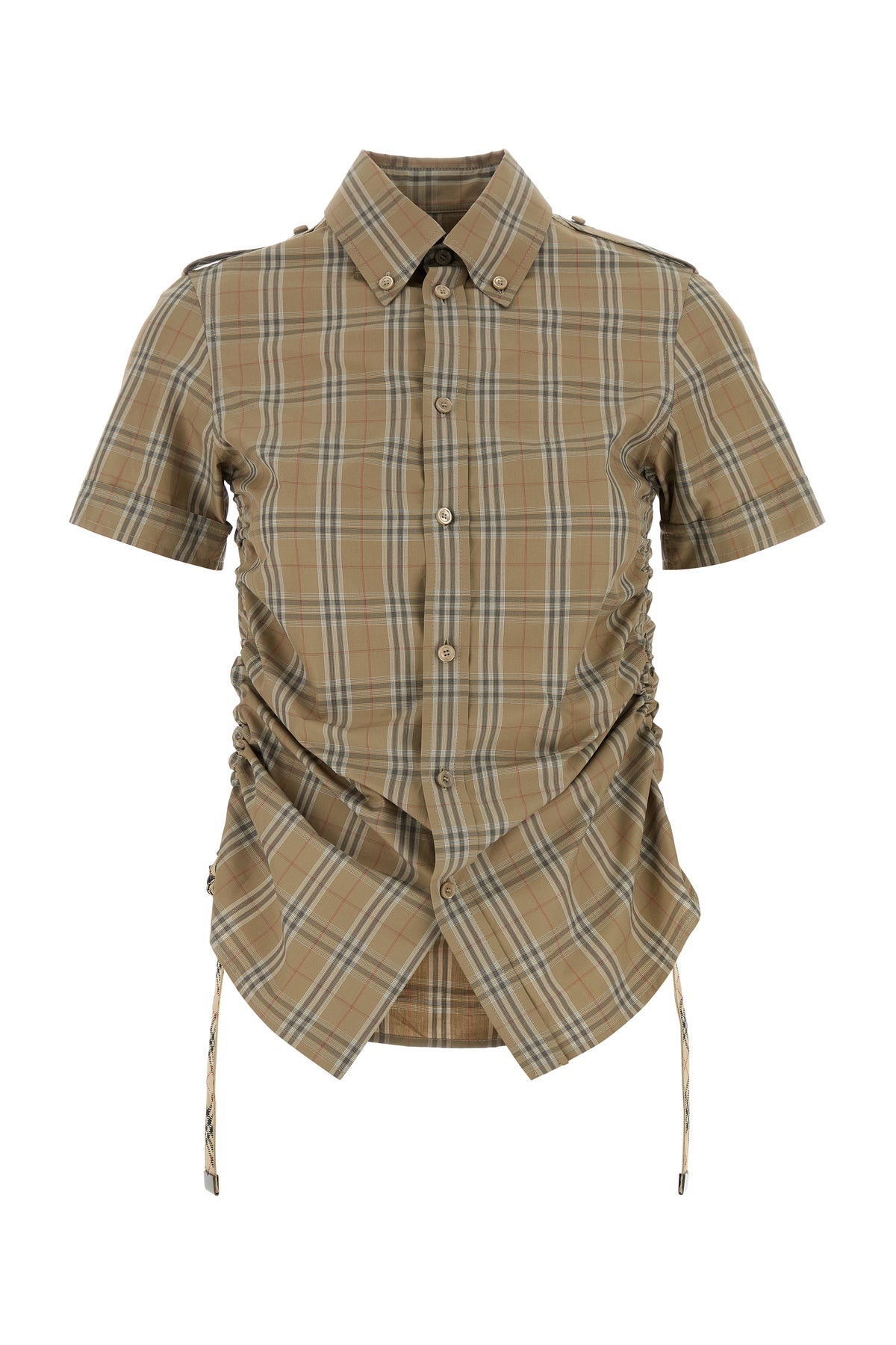 Short-sleeves shirt realized in pure cotton poplin characterized by Burberry Check embroidery on the entire surface. - Button-down collar - Buttons closure - Drawstring on the sides - Rear yoke DETAILS Embroidered poplin shirt Exterior: 100% Cotton Made in tunisia Sample size: 4