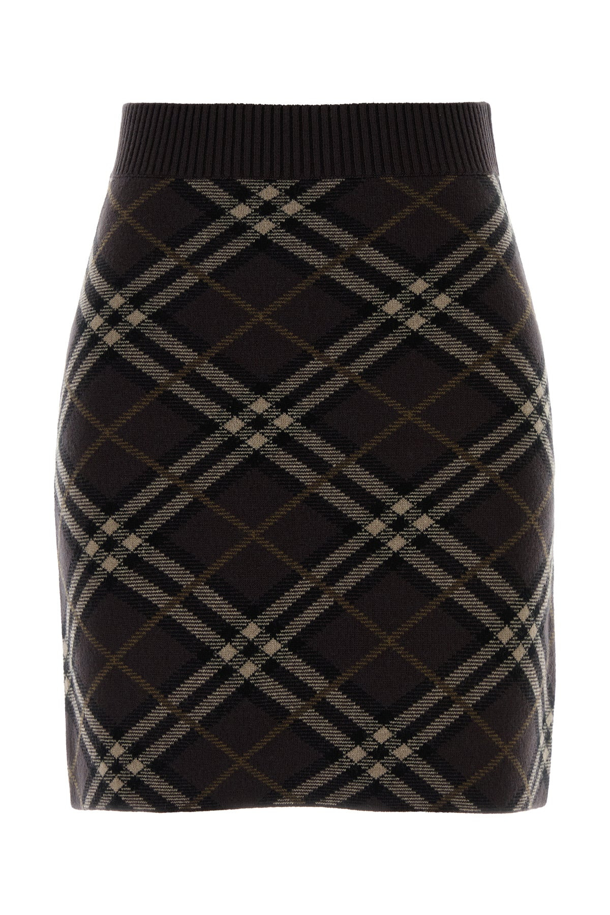 Mini skirt realized in stretch wool blend characterized by Burberry Check embroidery on the entire surface. - Elastic waist - Unlined DETAILS Embroidered stretch wool blend mini skirt Exterior: 71% Wool 27% Cashmere 1% Nylon 1% Elastane Made in romania Sample size: XS