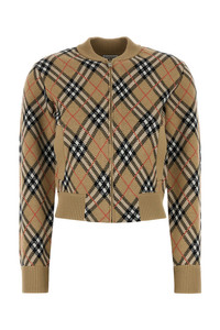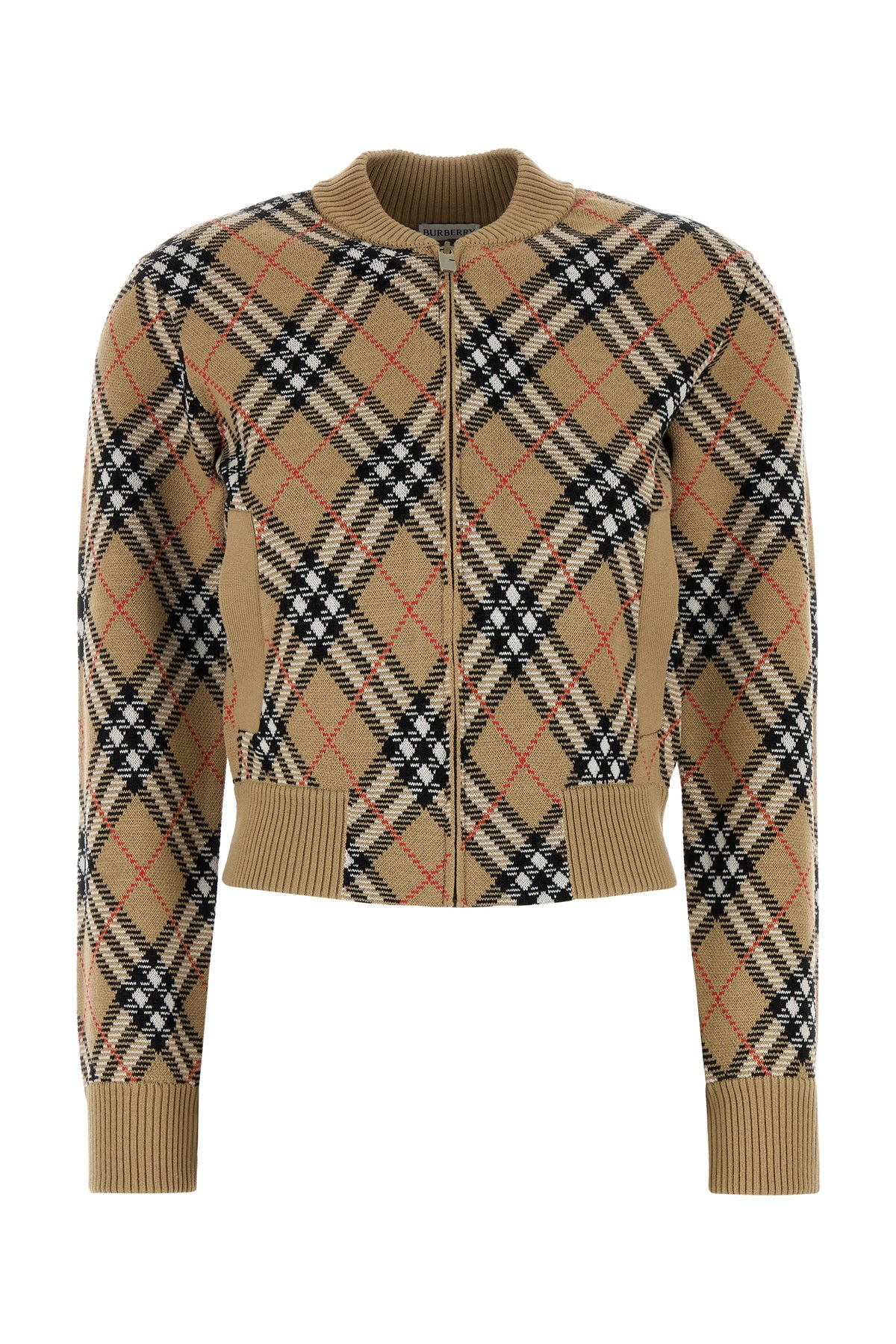 Cardigan realized in wool blend characterized by Burberry Check embroidery on the entire surface. - Ribbed crew-neck, cuffs and hemline - Zip closure - Two slit pockets at the front DETAILS Embroidered wool blend cardigan Exterior: 91% Wool 9% Polyester Made in romania Sample size: XS
