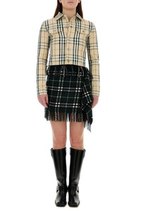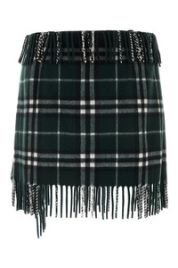 Mini skirt realized in wool and cashmere characterized by Burberry Check embroidery on the entire surface. - Wrap closure by buckle - Fringed trimmings - Lined DETAILS Embroidered wool blend mini skirt Exterior: 85% Wool 15% Cashmere Lining: 100% Fabric Made in romania Model is 174 cm and is wearing a size S