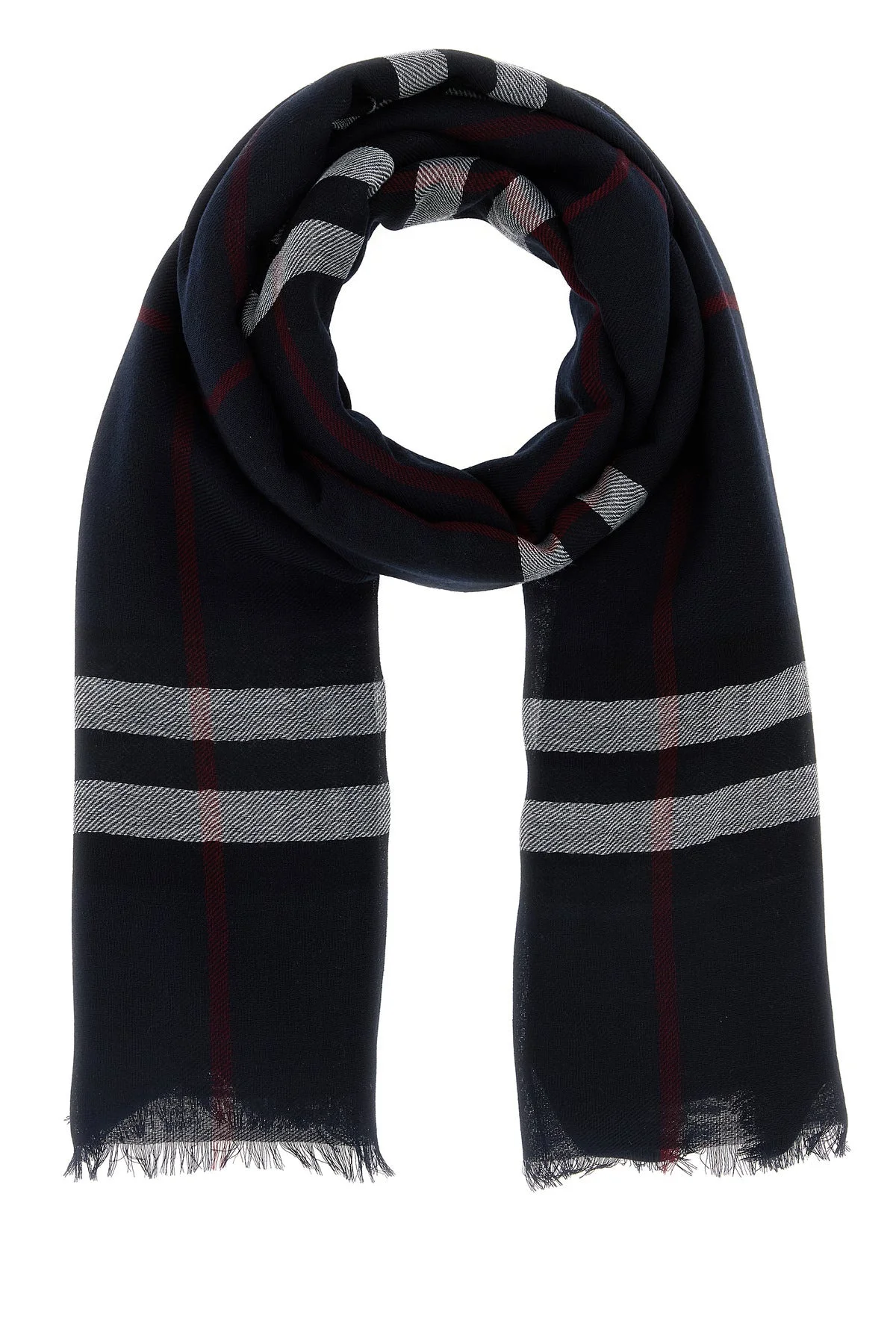 Scarf realized in pure wool characterized by Burberry Check embroidery on the entire surface. - Fringed hems DETAILS Embroidered wool scarf Exterior. 100% Wool Made in italy Length: 200 cm Height: 90 cm
