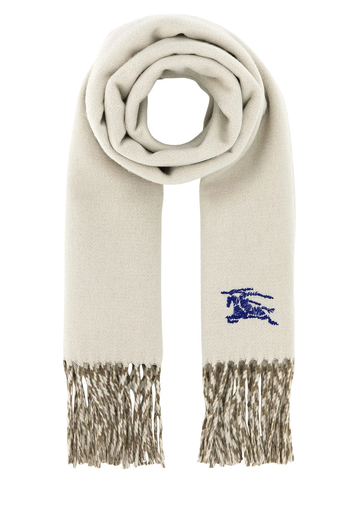 Reversible scarf realized in pure cashmere characterized by Equestrian Knight embroidery on the hemline. - Fringed edges - Contrasting interior DETAILS Ivory cashmere reversible scarf Exterior: 100% Cashmere Made in scotland Length: 168 cm Height: 30 cm