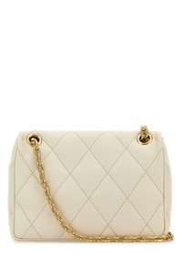 Shoulder bag realized in quilted calf leather enriched by metal Knight Stamp detail on the flap. - Metal chain shoulder strap with tonal leather shoulder pads that can be worn single or double - Magnetic button closure under the flap - Lined interior with a zip pocket DETAILS Ivory leather small Strand shoulder bag Exterior: 100% Calf Lining: 100% Cotton Finishing: Golden metal Made in italy Width: 20,5 cm Height: 16 cm Depth: 7,5 cm Min shoulder strap length: 28 cm Max shoulder strap length: 52 cm