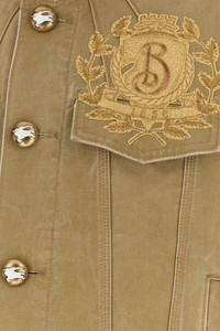 Jacket realized in pure cotton denim characterized by contrasting B Shield embroidery on the chest. - High collar - Buttons closure - Two slit pockets at the front - Straps on the cuffs - Adjustable straps at the back - Unlined DETAILS Khaki denim jacket Exterior: 100% Cotton Made in italy Sample size: 50