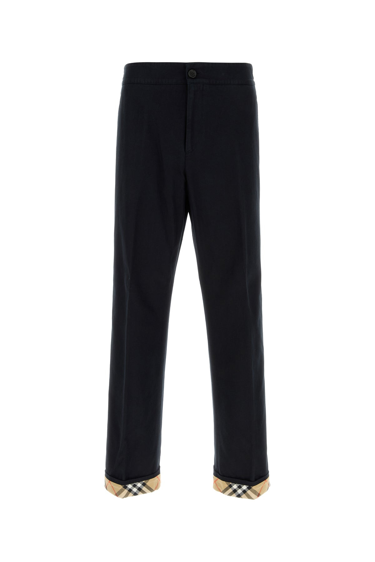 Pant realized in pure cotton gabardine characterized by tonal Equestrian Knight embroidery at the back enriched by Burberry Check motif fabric inserts on the folded hemline. - Belt loops at the waist - Partial elastic waist - Concealed zip and a single visible button closure - Slant pockets and a patch pocket at the back DETAILS Navy blue gabardine pant Exterior: 100% Cotton Made in italy Model is 190 cm and is wearing a size 50