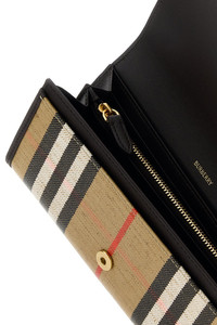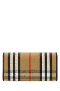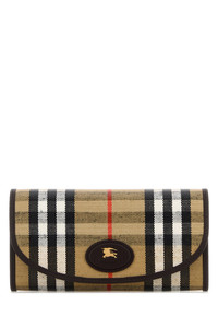 Wallet realized in coated canvas characterized by Burberry Check print on the entire surface enriched by Equestrian Knight patch at the front. - Snap button closure - Interior with two slit pockets, two gusseted compartments, a zip pocket and twelve credit card slots DETAILS Printed canvas Highlands wallet Exterior: 69% Cotton 21% Viscose 10% Linen Finishing: Golden metal Made in moldova Width: 20 cm Height: 10 cm Depth: 4 cm