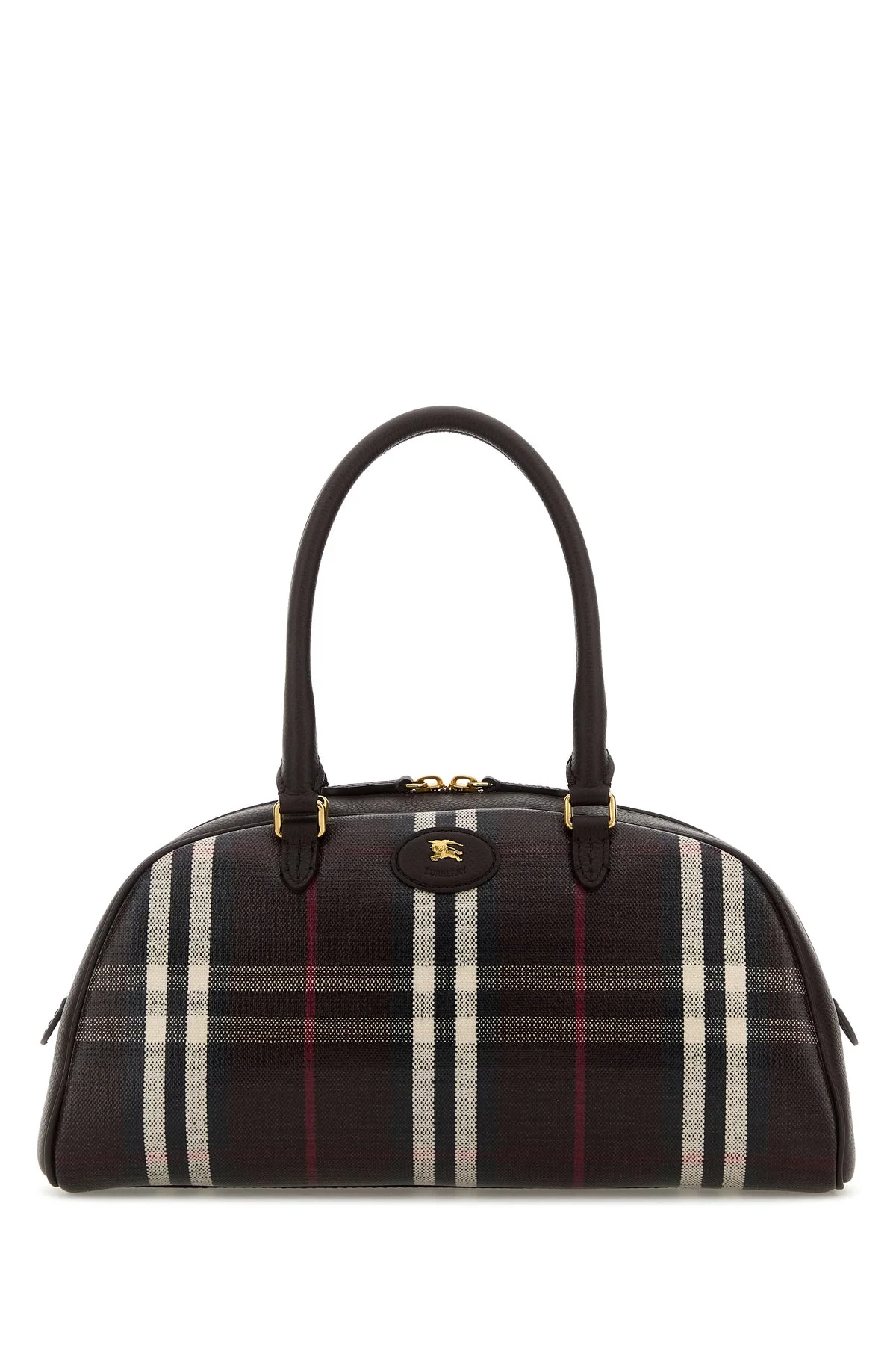 Handbag realized in coated canvas characterized by Burberry Check print on the entire surface enriched by Equestrian Knight patch at the front. - Two round leather handles - Adjustable detachable leather shoulder strap - Zip closure - Lined interior with a patch pocket DETAILS Printed canvas medium Highlands handbag Exterior: 69% Cotton 21% Viscose 10% Linen Lining: 100% Cotton Finishing: Golden metal Made in italy Width: 33 cm Height: 17 cm Depth: 12,5 cm Handle height: 15 cm Min shoulder strap length: 37 cm Max shoulder strap length: 50 cm