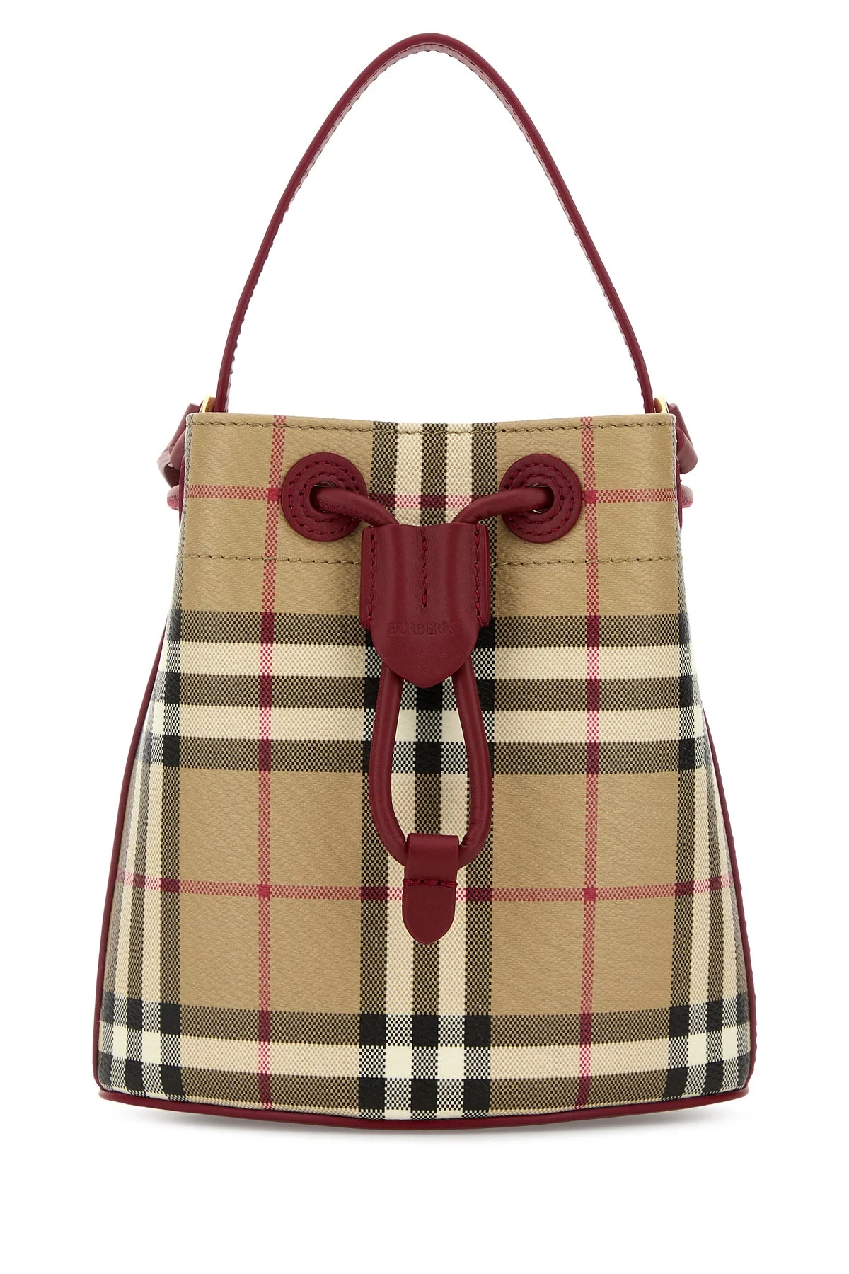 Bucket bag realized in coated canvas characterized by Burberry Check print on the entire surface. - A leather flat handle - Adjustable detachable leather shoulder strap - Drawstring closure - Lined DETAILS Printed canvas mini Check bucket bag Exterior: 55% Polyurethane 25% Polyester 20% Cotton Lining: 100% Cotton Finishing: Golden metal Made in italy Width: 16,5 cm Height: 18,5 cm Depth: 11 cm Handle height: 10 cm Min shoulder strap length: 48 cm Max shoulder strap length: 54 cm