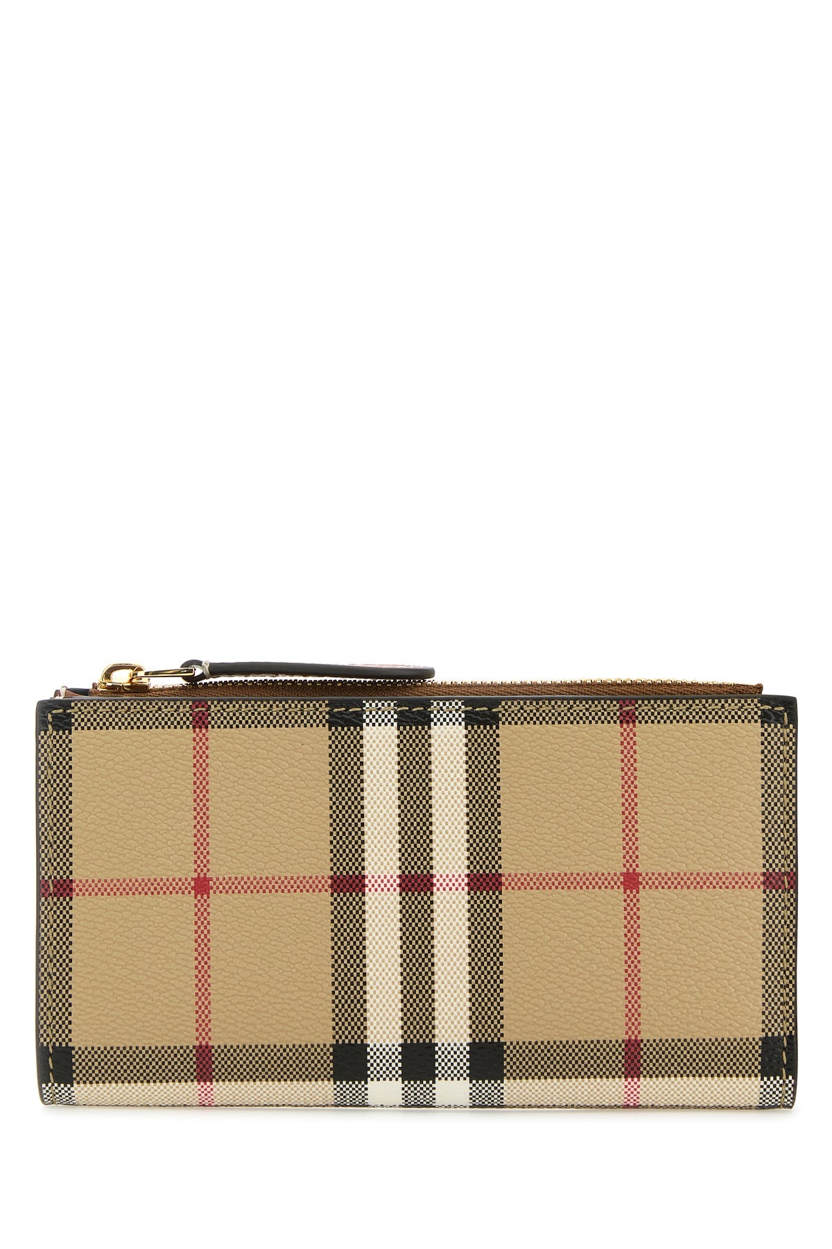 Wallet realized in coated canvas characterized by Burberry Check print on the entire surface. - Snap button closure - Interior with a bill compartment, a coin pocket, two slit pockets and ten credit card slots DETAILS Printed canvas wallet Exterior: 71% Poliurethane 16% Polyester 12% Cotton 1% Acrylic Made in moldova Width: 14,5 cm Height: 8,5 cm Depth: 2,5 cm