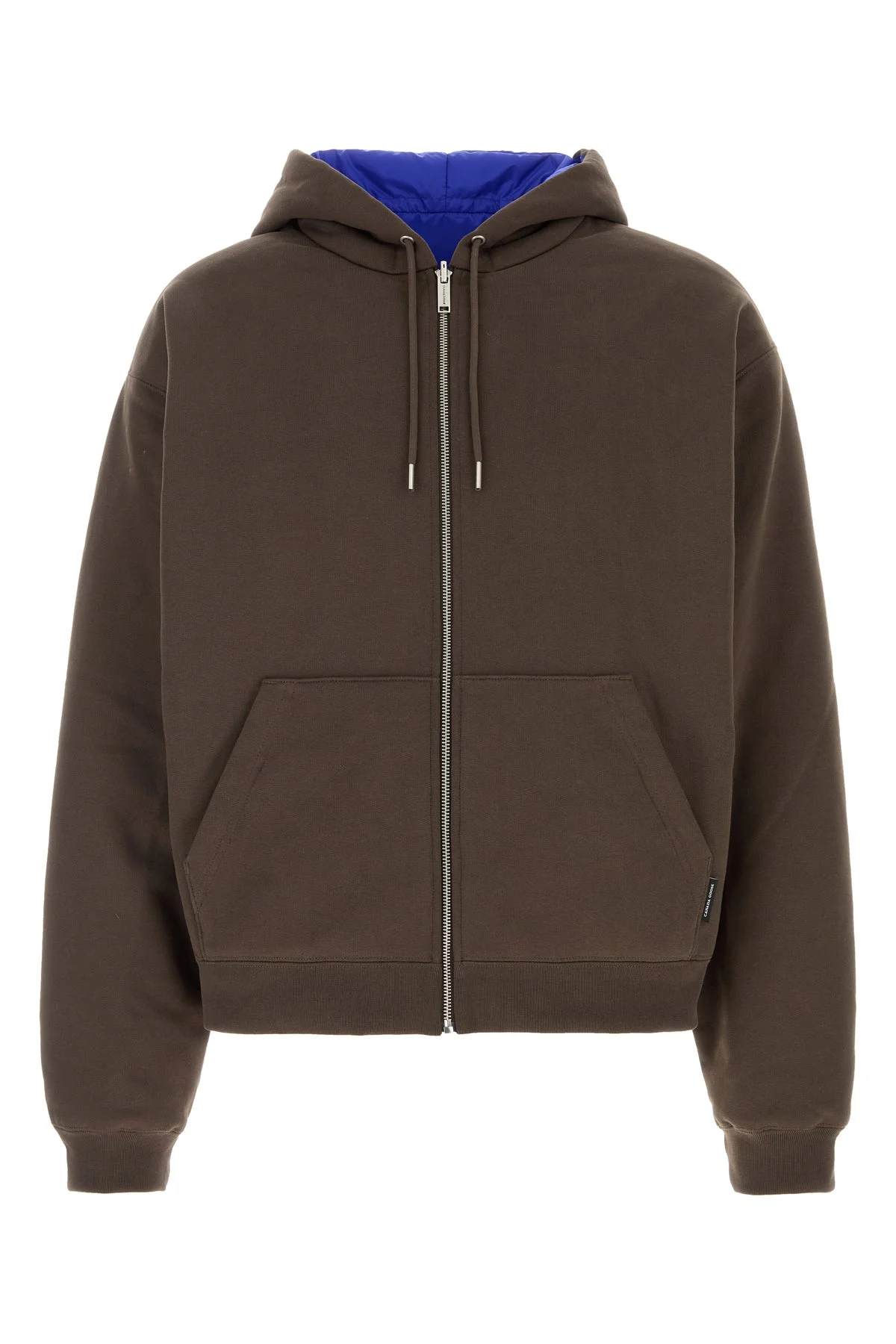 Reversible padded sweatshirt realized in pure cotton enriched by logoed label at the front. - Drawstring hood - Zip closure - Two patch pockets at the front - Ribbed cuffs and hemline - Contrasting quilted polyester interior DETAILS Brown cotton reversible sweatshirt Exterior: 100% Cotton Lining: 100% Polyester Padding: 90% Down 10% Feather Made in romania Sample size: M