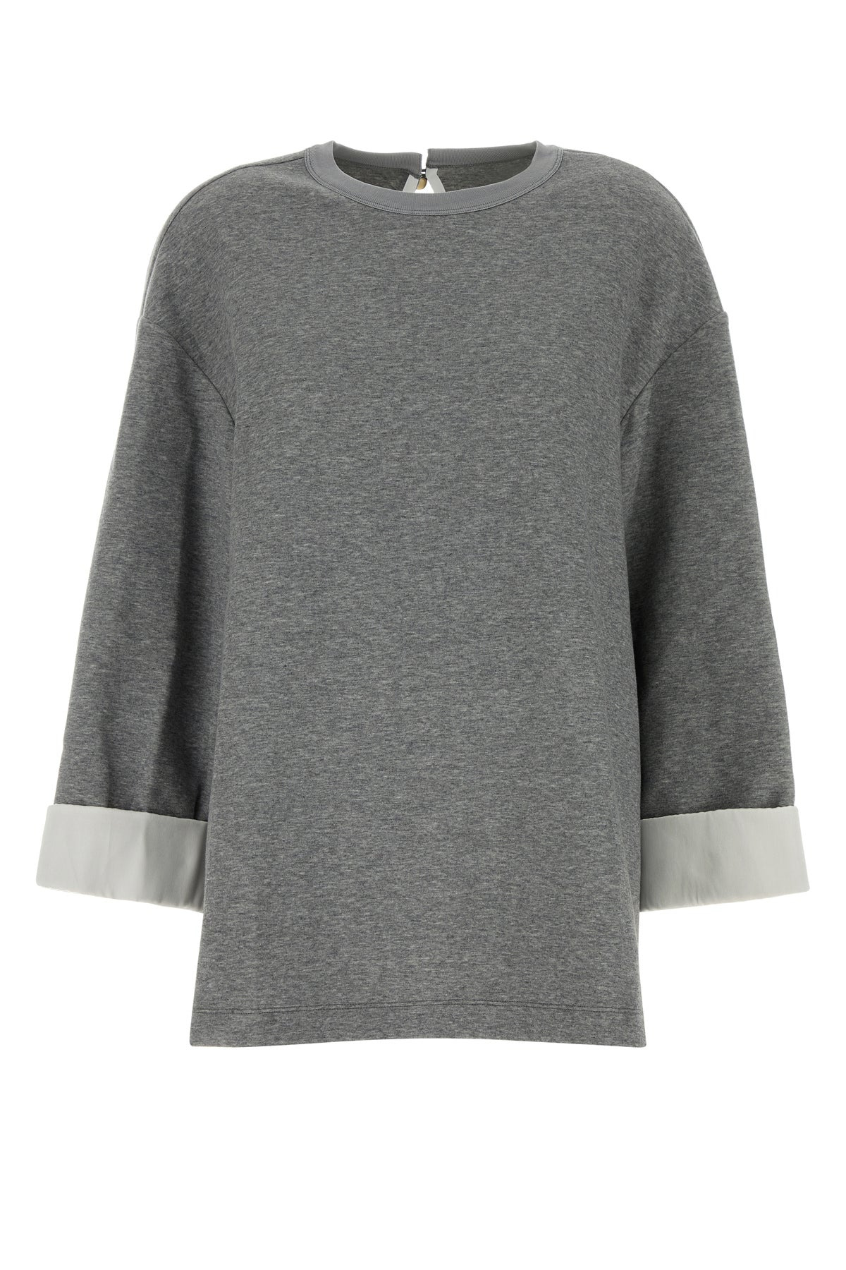 Oversize sweatshirt realized in nylon blend characterized by contrasting satin cuffs. - Ribbed crew-neck - Drop-shaped opening with button at the back DETAILS Grey nylon blend oversize sweatshirt Exterior: 47% Nylon 44% Cotton 9% Cashmere Made in china Sample size: XS