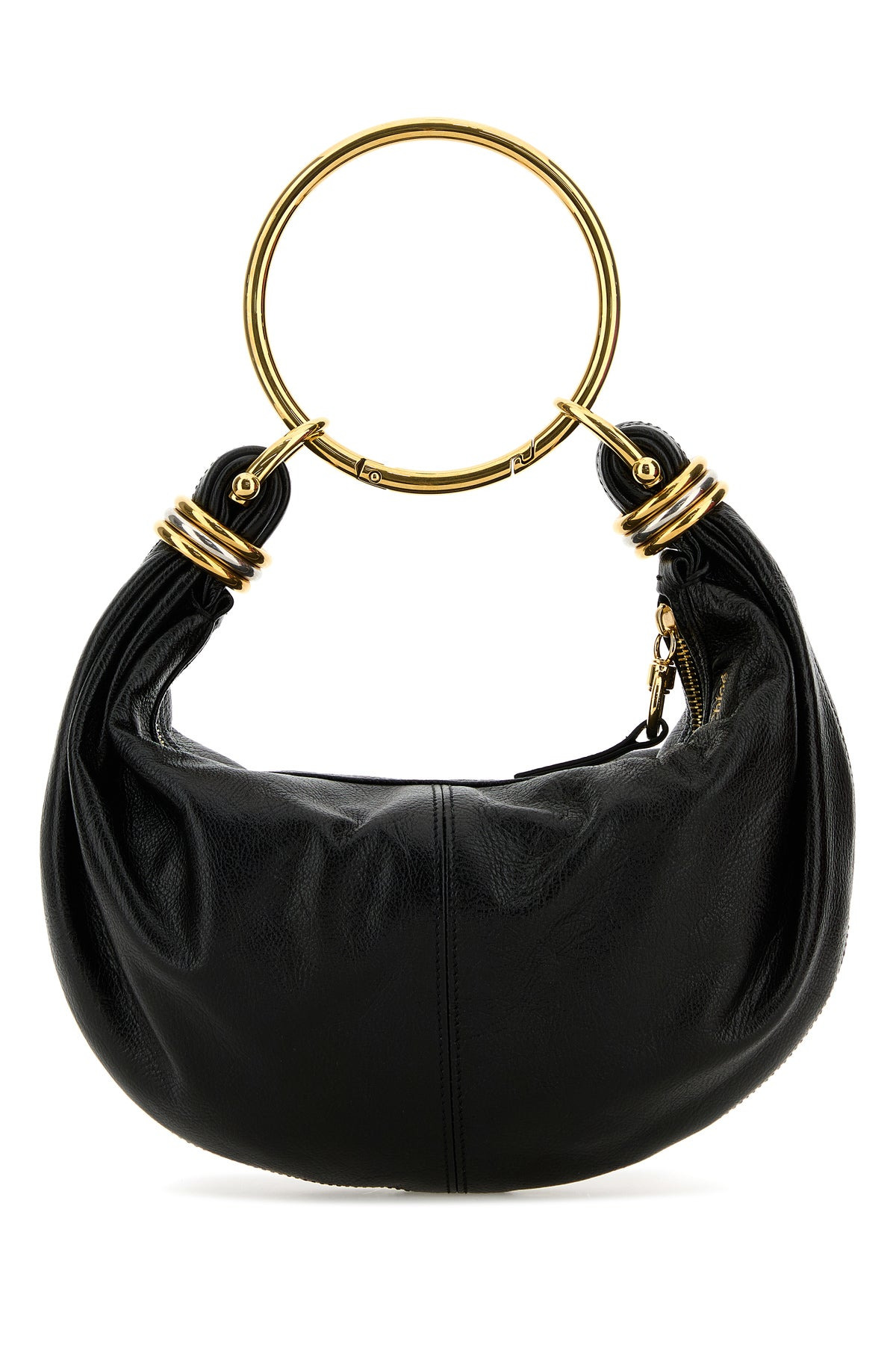 Handbag realized in pebble calf leather characterized by laminated printed logo at the front. - A metal round handle - Adjustable detachable tonal leather shoulder strap - Zip closure - Slit-leather interior DETAILS Black leather Bracelet handbag Exterior: 100% Calf Finishing: Golden metal Made in italy Width: 32 cm Height: 14 cm Depth: 10 cm Handle height: 20 cm Min shoulder strap length: 50 cm Max shoulder strap length: 60 cm