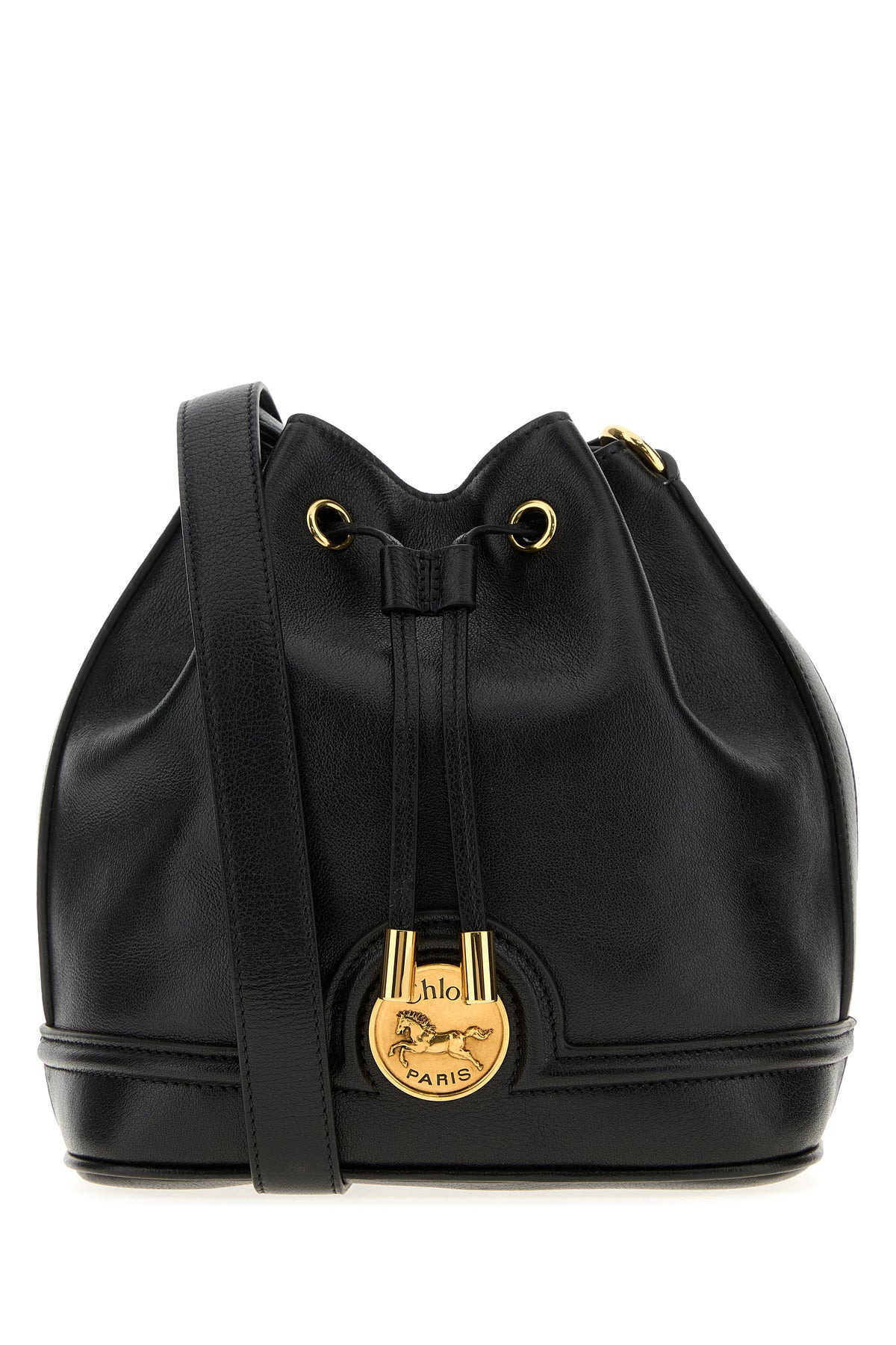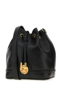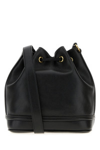 Bucket bag realized in pebble leather enriched by logoed metal detail at the front. - Adjustable tonal leather shoulder strap - Drawstring closure - Lined interior with a patch pocket DETAILS Black leather bucket bag Exterior: 100% Leather Lining: 100% Fabric Finishing: Antiqued golden metal Made in spain Width: 24 cm Height: 24 cm Depth: 14 cm Min shoulder strap length: 40 cm Max shoulder strap length: 60 cm
