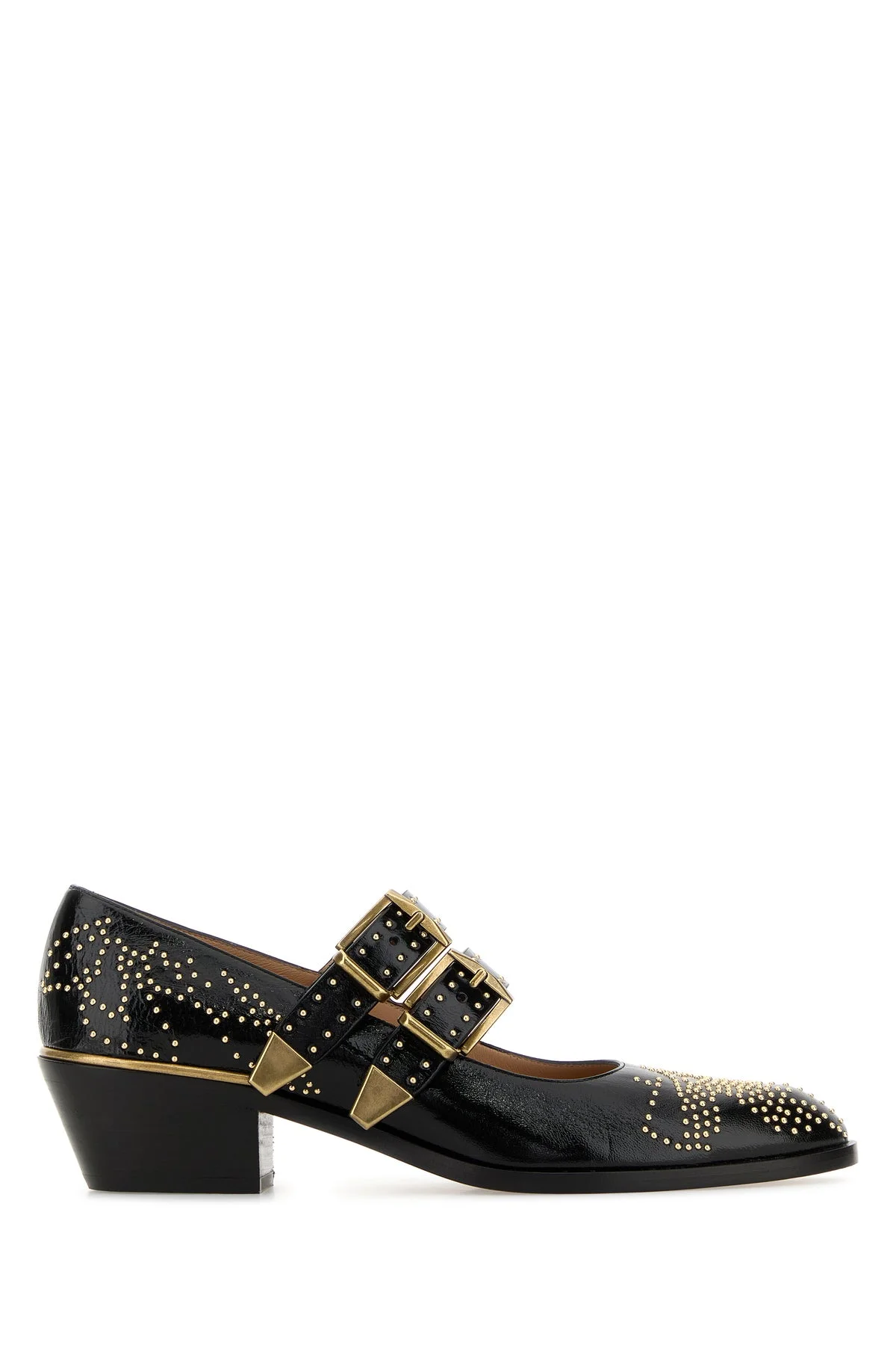 Pumps realized in polished finish leather enriched by metal studs on the round toe and on the adjustable straps on the instep. - Embossed logo on the inside - Thick heel DETAILS Black leather Susan pumps Exterior: 100% Leather Interior: 100% Leather Sole: Leather Made in spain Heel height: 4 cm