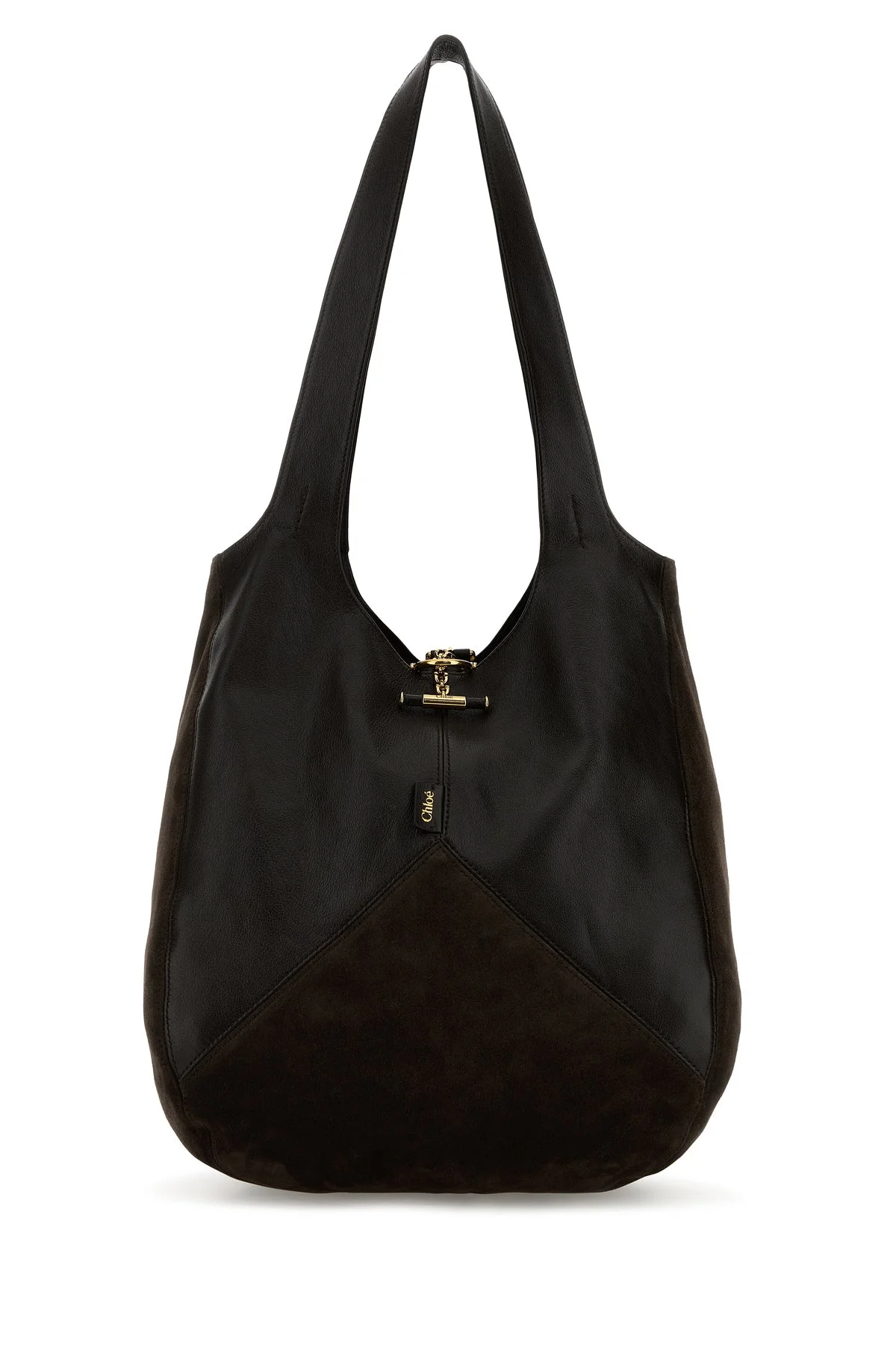 Shopping bag realized in suede and pebble leather enriched by logoed label at the front. - Two leather flat handle - Snap-fit closure - Unlined DETAILS Brown suede and leather Balloon shopping bag Exterior: 100% Calf Finishing: Golden metal Made in italy Width: 32 cm Height: 32 cm Depth: 30 cm Handle height: 38 cm