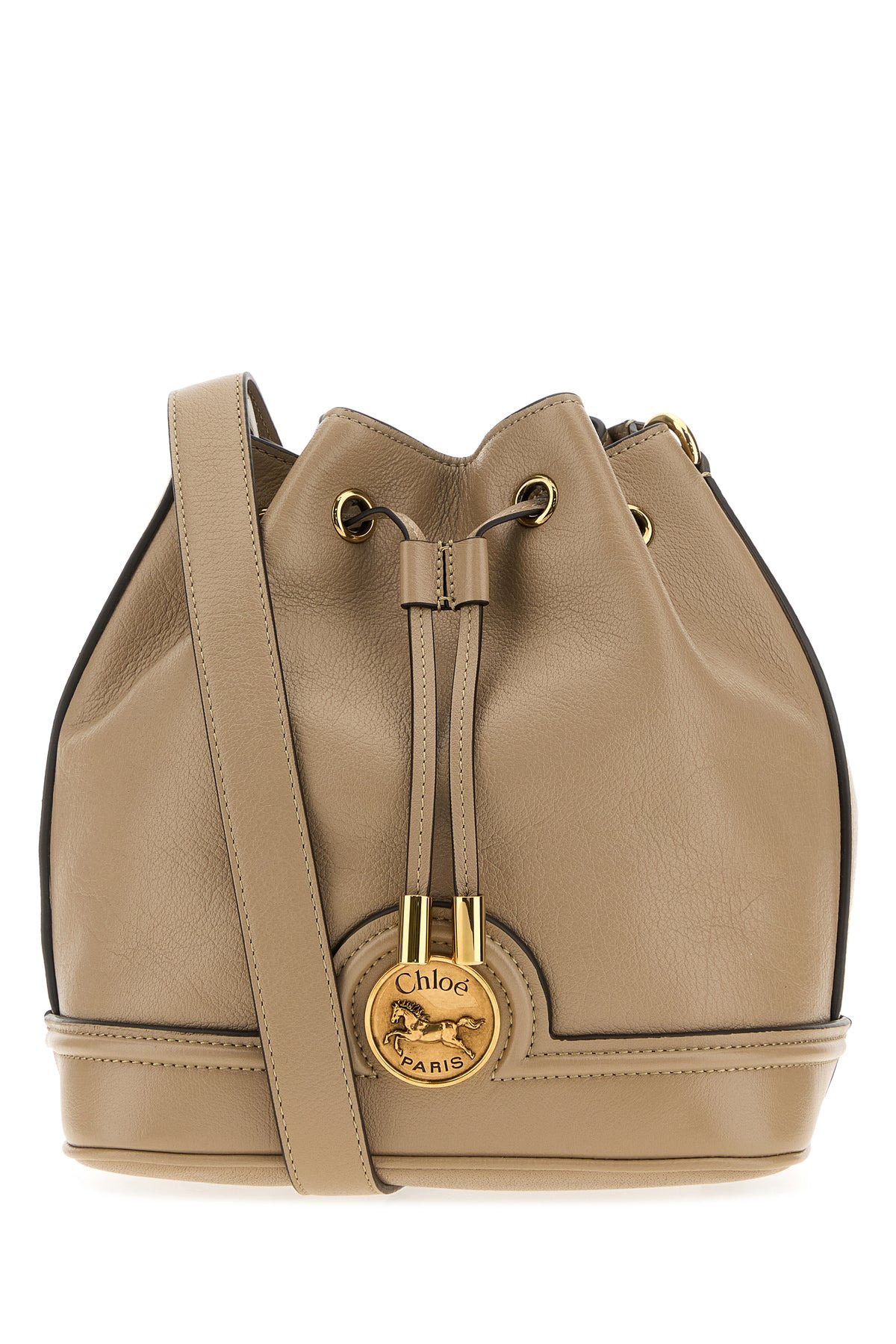 Bucket bag realized in pebble leather enriched by logoed metal detail at the front. - Adjustable tonal leather shoulder strap - Drawstring closure - Lined interior with a patch pocket DETAILS Cappuccino leather bucket bag Exterior: 100% Leather Lining: 100% Fabric Finishing: Antiqued golden metal Made in Width: 24 cm Height: 24 cm Depth: 14 cm Min shoulder strap length: 40 cm Max shoulder strap length: 60 cm