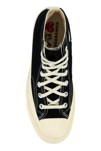 High-top sneakers created in collaboration with Converse realized in canvas characterized by iconic printed Heart on the side enriched by contrasting insert at the back. - Printed logo on the side - Lace- up closure - Reinforced toe - Printed logo on the inside DETAILS Black canvas Comme Des Garcons X Converse sneakers Exterior: 100% Fabric Interior: 100% Fabric Sole: Rubber Made in vietnam