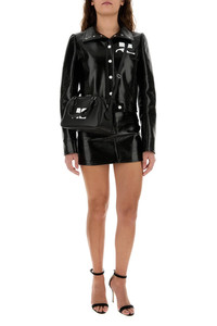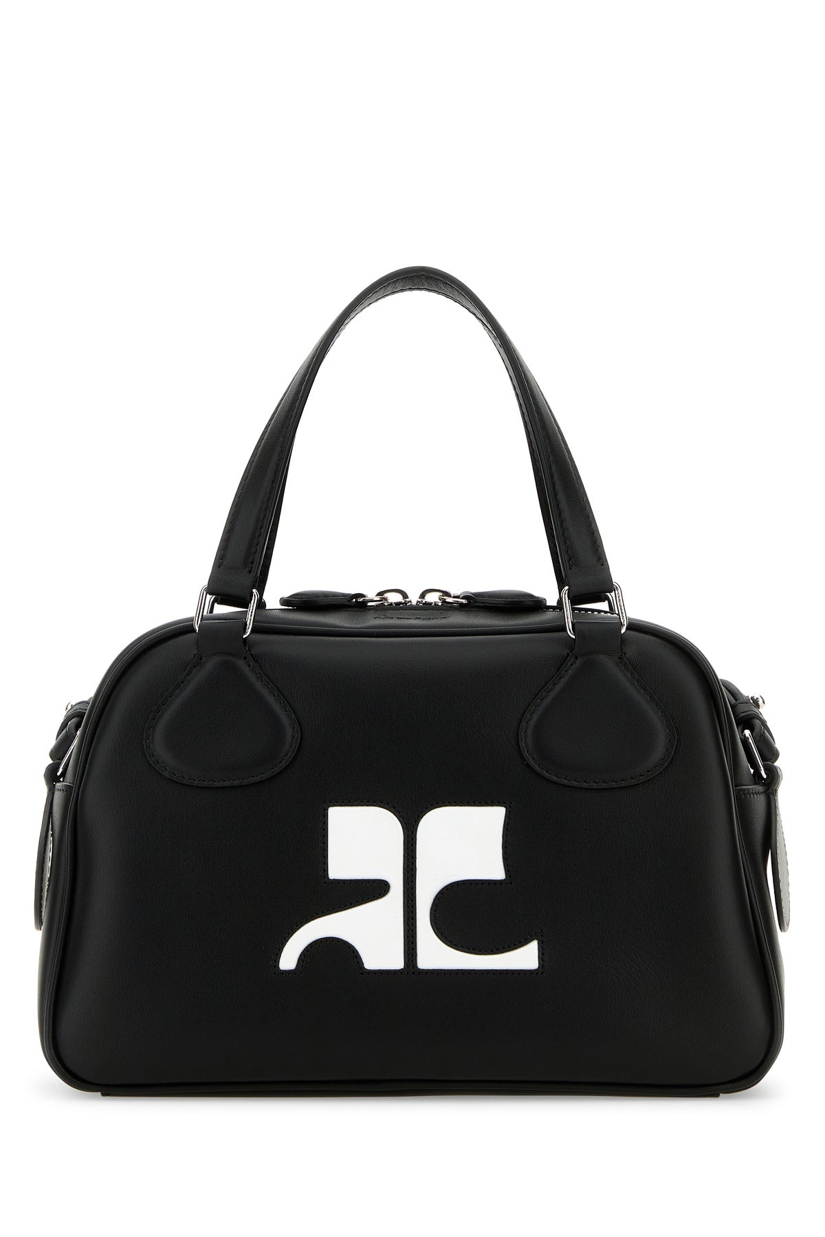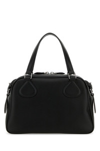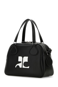 Handbag realized in slightly pebble calf leather enriched by contrasting logoed patch at the front. - Two tonal leather flat handles - Adjustable detachable tonal leather shoulder strap - Zip closure - Lined interior with a zip pocket DETAILS Black leather Reedition handbag Exterior: 100% Calf Lining: 100% Fabric Finishing: Silver metal Made in italy Width: 25 cm Height: 15,5 cm Depth: 12 cm Handle height: 11 cm Min shoulder strap length: 47 cm Max shoulder strap length: 55 cm