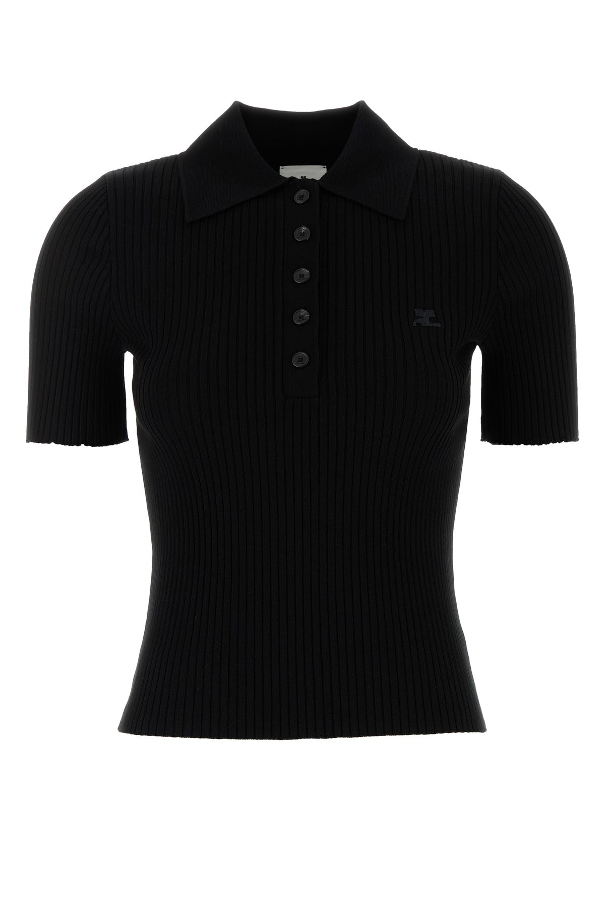 Polo shirt realized in ribbed viscose blend enriched by tonal logoed patch on the chest. - Collar - Partial buttons closure DETAILS Black viscose blend polo shirt Exterior: 70% Viscose 30% Polyester Made in Sample size: XS