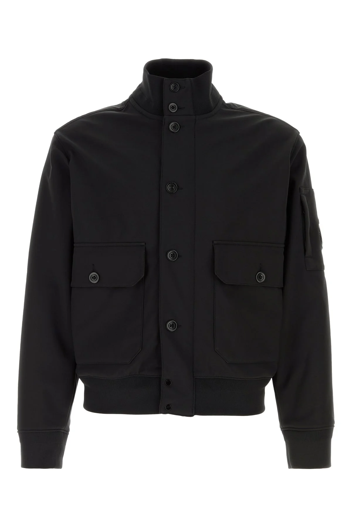 Jacket realized in stretch polyester enriched by tonal logoed detail on the sleeve. - Ribbed high neck, cuffs and hemline - Concealed zip and visible buttons closure - Two flap pockets at the front and a zip pocket on the sleeve - Unlined DETAILS Black stretch polyester jacket Exterior: 94% Polyester 6% Elastane Made in myanmar Sample size: M