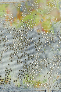 Crop-top realized in distressed denim with mesh inserts entirely covered by rhinestones. - Round neckline - Zip closure on the side DETAILS Exterior: 78% Cotton 22% Nylon Made In Italy Sample size: XS