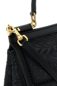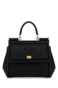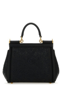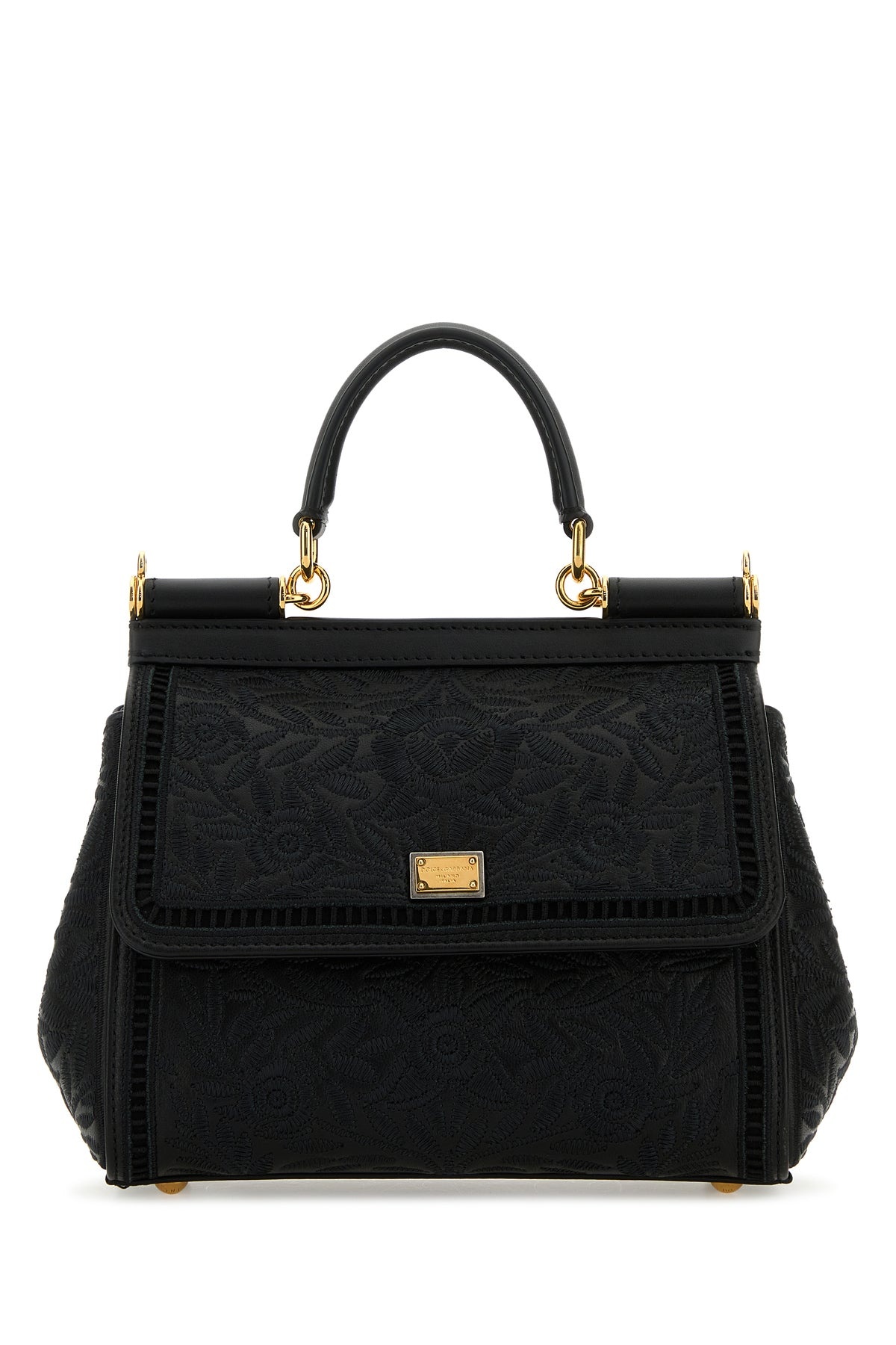 Handbag realized in calf leather characterized by tonal floral embroidery on the entire surface enriched by metal logoed plate at the front. - Tonal leather round handle - Adjustable detachable tonal leather shoulder strap - Magnetic buttons closure - Lined interior with a zip pocket, a credit card slot and a patch pocket DETAILS Black leather medium Sicily handbag Exterior: 100% Calf Lining: 100% Fabric Finishing: Golden metal Made in italy Width: 25 cm Height: 23 cm Depth: 11,5 cm Handle height: 8 cm Min shoulder strap length: 48 cm Max shoulder strap length: 57 cm