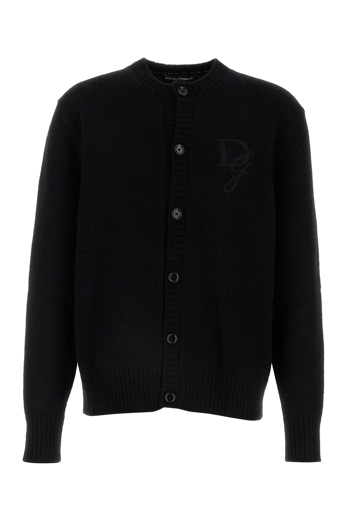 Cardigan realized in nylon blend enriched by tonal logoed patch on the chest. - Ribbed crew-neck, cuffs and hemline - Buttons closure at the front DETAILS Black nylon blend cardigan Exterior: 40% Nylon 33% Alpaca 27% Wool Made in italy Sample size: 48