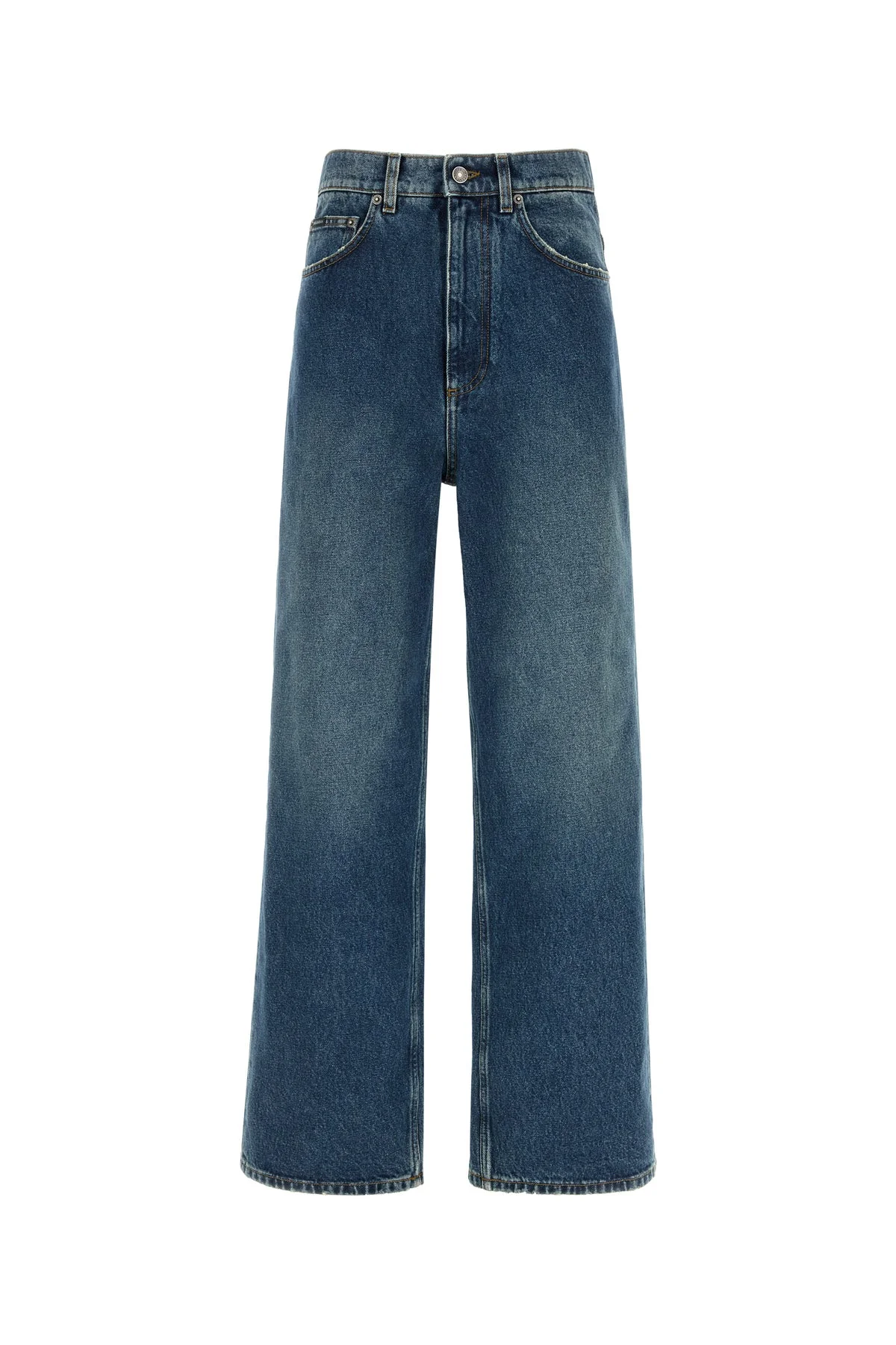 High waist jeans realized in slightly stonewashed pure cotton denim enriched by metal logoed plate at the back. - Belt loops at the waist - Concealed zip and a single visible button closure - Five classic pockets - Distressed trimmings DETAILS Denim jeans Exterior: 100% Cotton Made in italy Sample size: 38