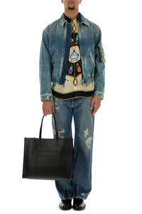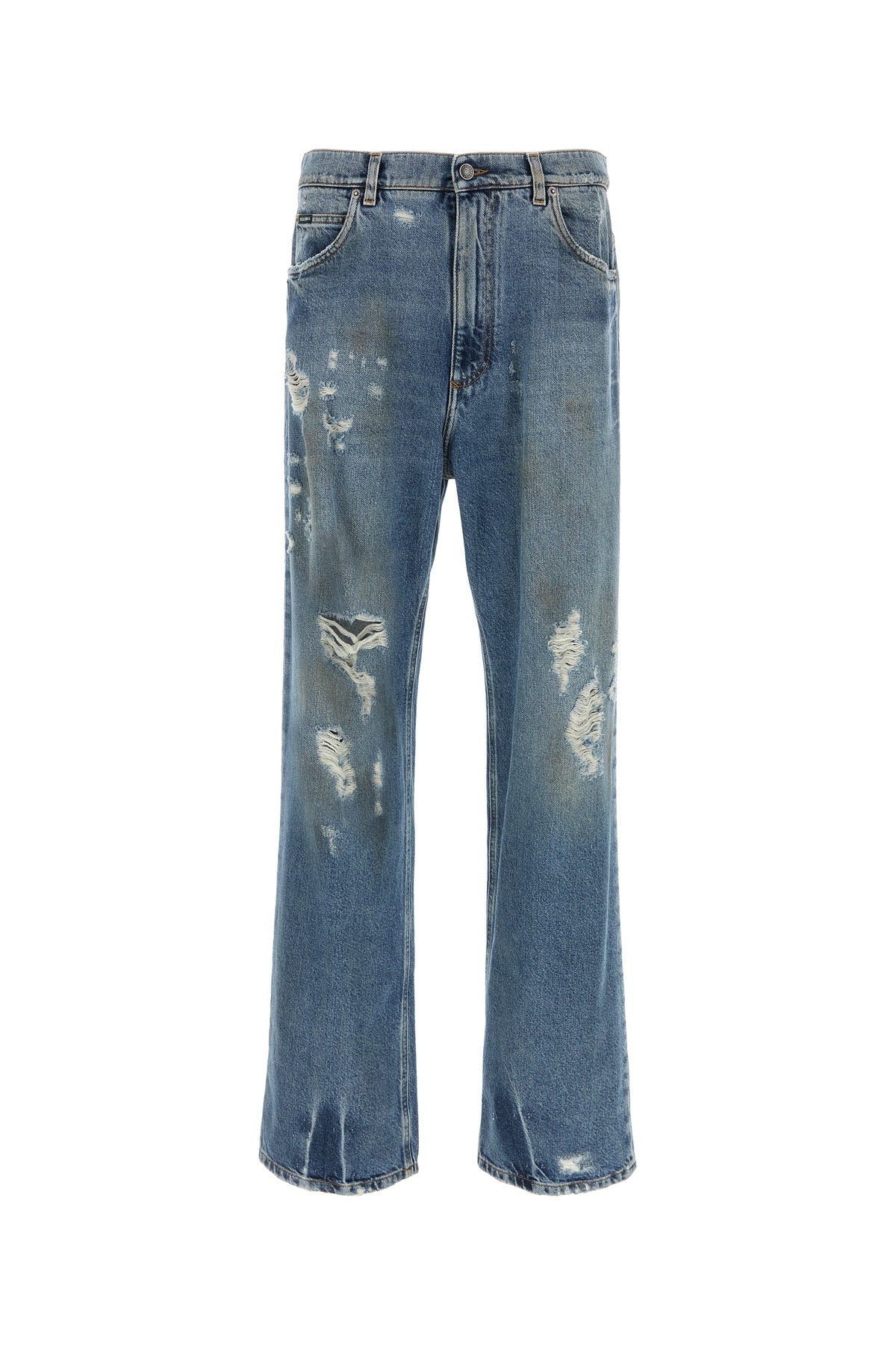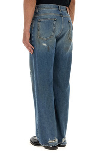 Wide-leg jeans realized in stonewashed and distressed pure cotton denim with intentional rips enriched by metal logoed plate at the back. - Belt loops at the waist - Concealed zip and a single visible button closure - Five classic pockets - Logoed label at the back DETAILS Denim wide-leg jeans Exterior: 100% Cotton Made in italy Model is 190 cm and is wearing a size 48