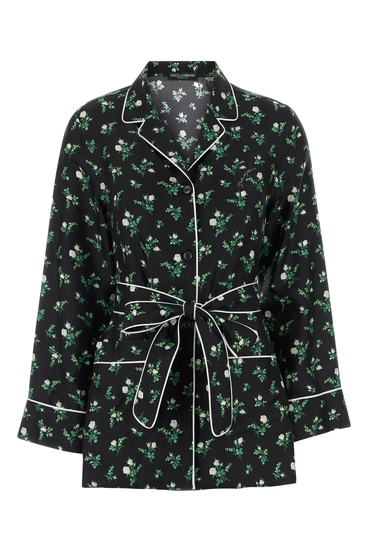Shirt realized in pure silk twill characterized by Roses and Lilies print on the entire surface. - Notched collar - Buttons closure - Belt to tie at the waist - Two patch pockets at the front DETAILS Printed twill shirt Exterior: 100% Silk Made in australia Model is 170 cm and is wearing a size 38