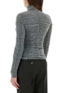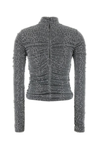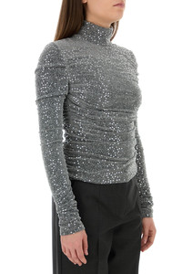 Draped top realized in jersey with lurex threads enriched by sequins on the entire surface. - High neck - Long sleeves - Concealed zip closure at the back - Lined DETAILS Silver jersey top Exterior: 45% Polyester 37% Metallized polyester 18% Nylon Lining: 77% Nylon 23% Elastane Made in italy Model is 170 cm and is wearing a size 38