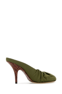 Mules realized in satin enriched by crocodile-motif embossed leather stiletto heel. - Maxi round toe - Printed logo on the inside DETAILS Olive green satin mules Exterior: 100% Fabric Interior: 100% Leather Sole: Leather Made in italy Heel height: 10 cm