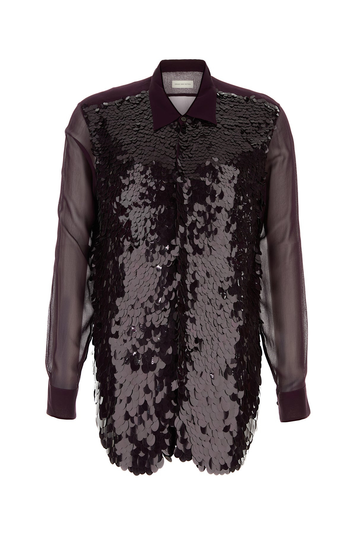 Long-cut shirt realized in crepe enriched by tonal sequins at the front. - Short-pointed collar - Buttons closure - Buttoned rounded cuffs DETAILS Purple crepe Curles shirt Exterior: 100% Viscose Made in india Sample size: 50