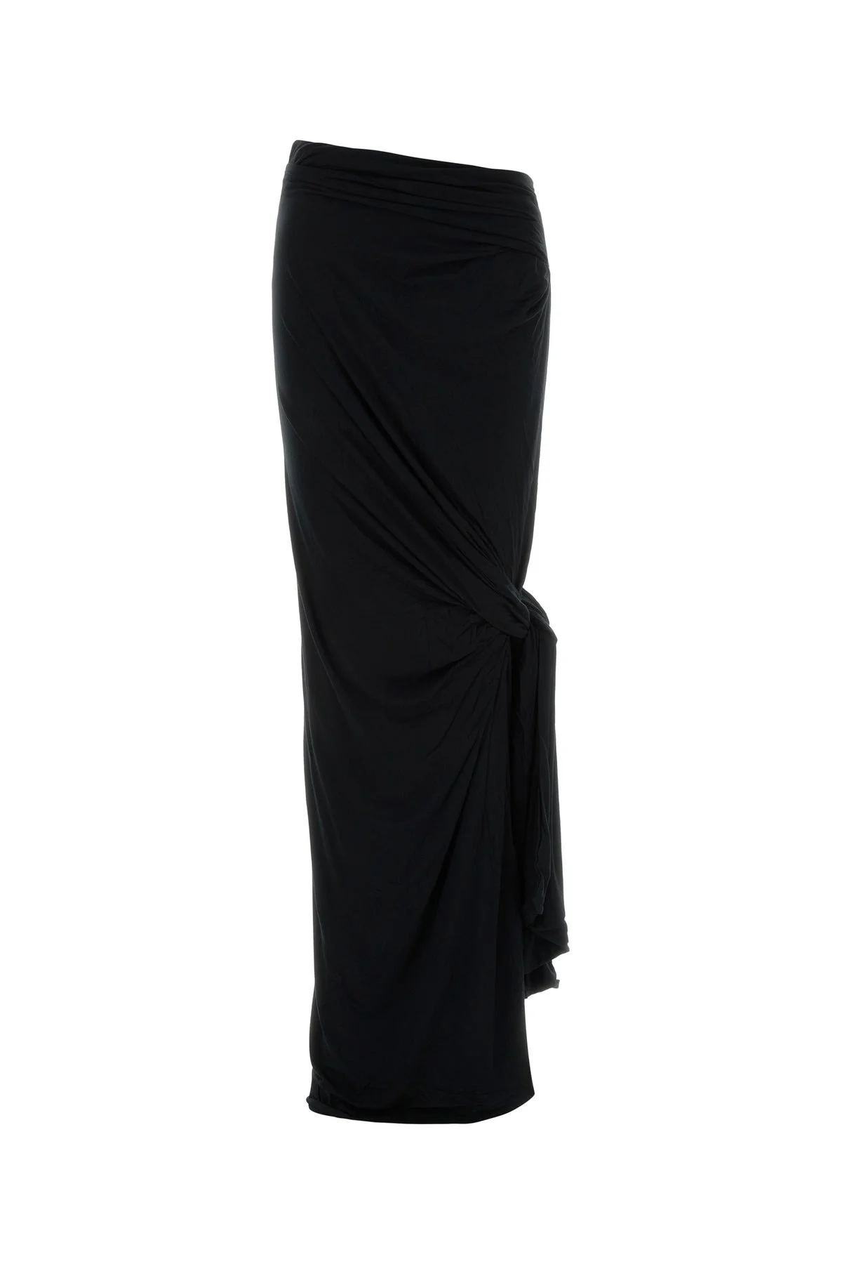 Long skirt realized in stretch viscose enriched by ribbons to tie on then side. - Elastic waist - Asymmetric hemline - Unlined DETAILS Black stretch viscose skirt Exterior: 92% Viscose 8% Elastane Made in china Sample size: M