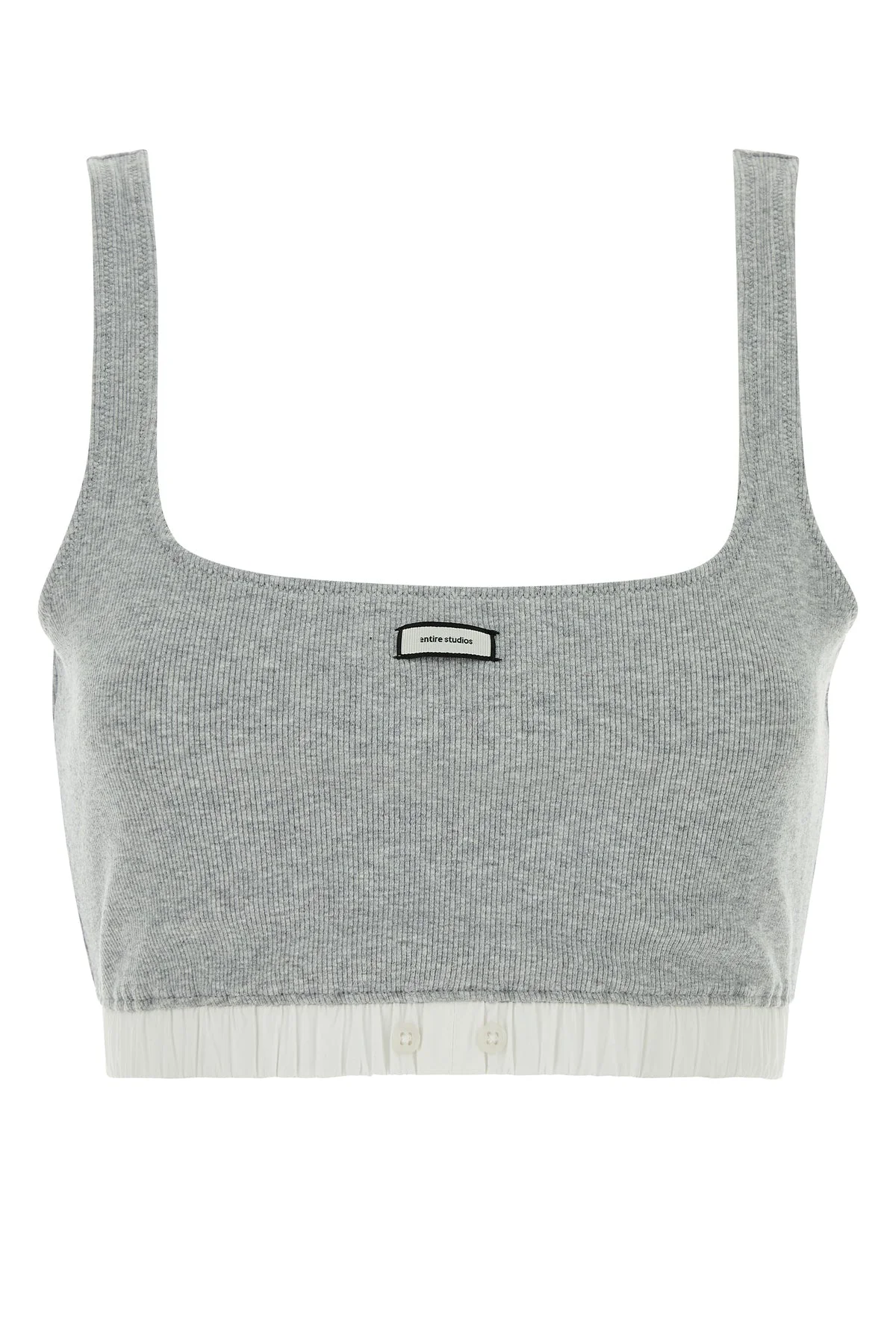 Crop-top realized in ribbed stretch cotton enriched by logoed label at the front. - Squared neckline - Contrasting poplin gathered elastic hemline DETAILS Grey stretch cotton crop-top Exterior: 93% Cotton 7% Elastane Made in china Sample size: M