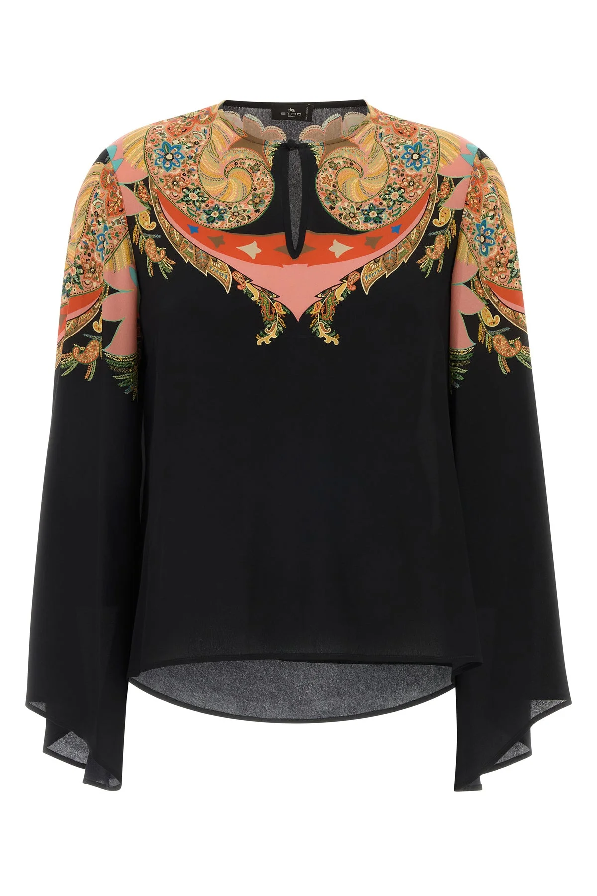 Blouse realized in pure silk crepe characterized by peculiar print at the top. - Crew-neck - Button closure at the front - Bell sleeves - Slightly longer back DETAILS Black crepe blouse Exterior: 100% Silk Made in italy Sample size: 42