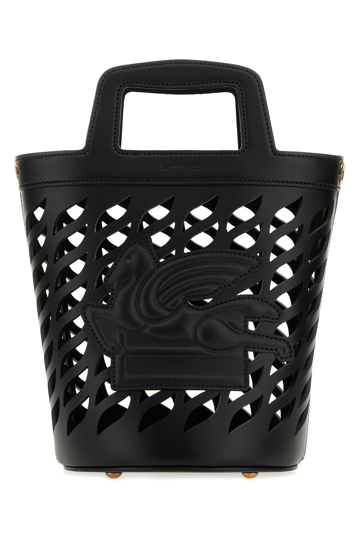 Bucket bag realized in leather characterized by peculiar cut-out details on the entire surface and ETRO Pegaso logo embroidered at the front. - Two tonal leather flat handles - Detachable fabric shoulder strap - Hook closure - Unlined interior - Protective metal feet at the base DETAILS Exterior: 100% Leather Lining: 100% Leather Finishing: Golden metal Made In Italy Width: 17 cm Height: 23 cm Depth: 17 cm Handle height: 5 cm Shoulder strap length: 50 cm