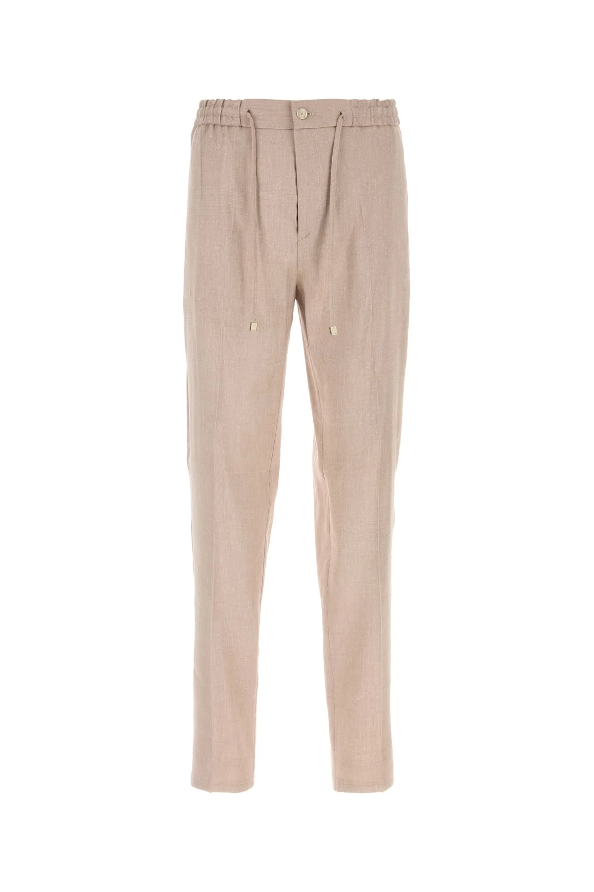Pant realized in linen blend. - Gathered elastic waist - Concealed zip and a single visible button closure - Slant pockets and two patch pockets at the back - Central ironed pleats DETAILS Sand linen blend pant Exterior: 63% Linen 34% Viscose 3% Elastane Made in italy Sample size: 48