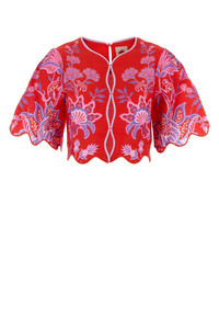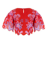 Blouse realized in pure linen characterized by Porcelain Garden print on the entire surface. - Round neckline - Buttoned opening at the back - Cut-out details at the front - Wavy trimmings DETAILS Printed linen blouse Exterior: 100% Cotton Made in china Sample size: XS