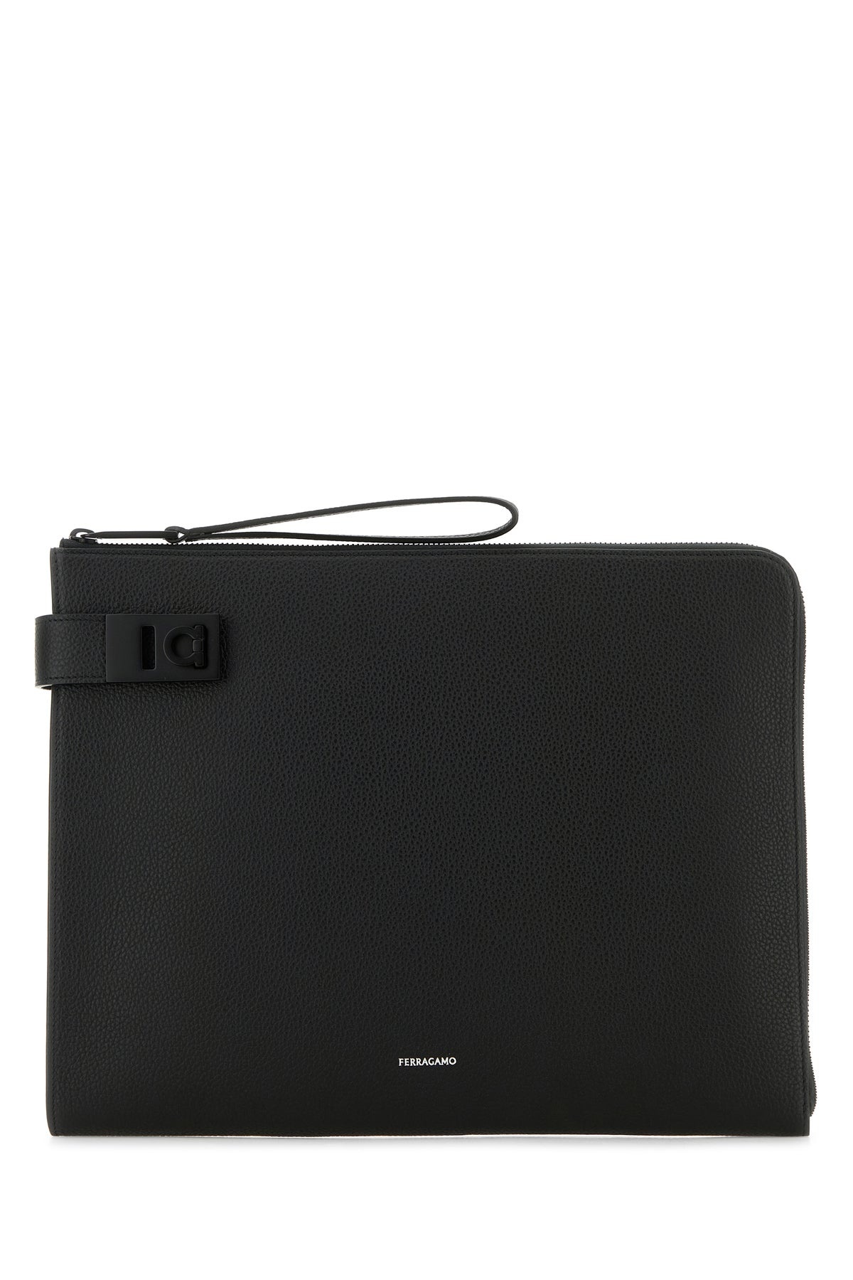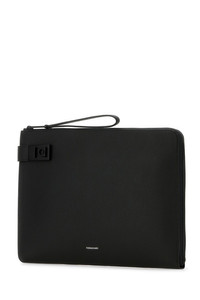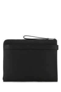Clutch realized in pebble calf leather characterized by laminated printed logo at the front. - Tonal leather wrist handle - Adjustable detachable tonal fabric shoulder strap - Zip closure - A slit pocket at the back - Lined interior with two patch pockets DETAILS Black leather clutch Exterior: 100% Calf Lining: 100% Fabric Finishing: Enameled metal Made in italy Width: 34 cm Height: 26 cm Depth: 2,5 cm Min shoulder strap length: 40 cm Max shoulder strap length: 60 cm