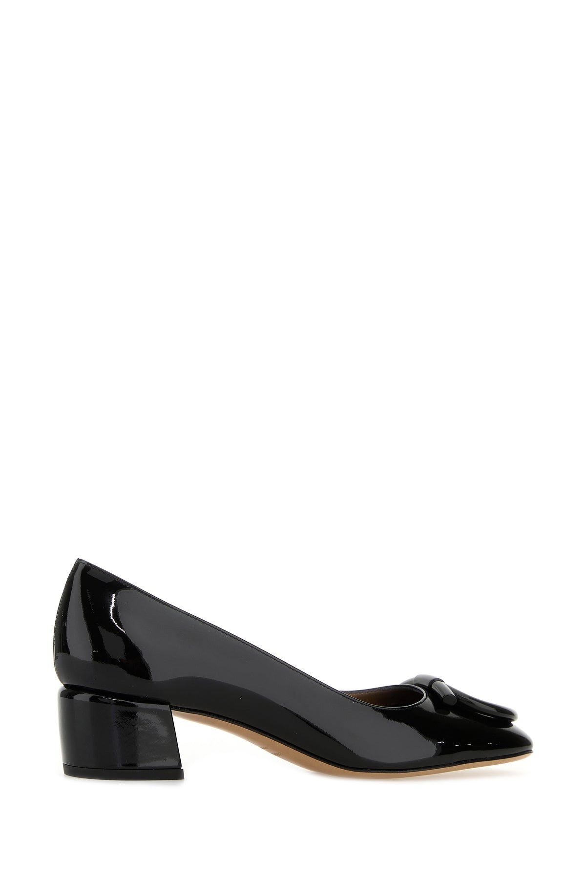 Pumps realized in patent calf leather enriched by tonal Gancini detail at the front. - Squared toe - Printed logo on the inside - Low heel DETAILS Black leather Mara pumps Exterior: 100% Calf Interior: 100% Leather Sole: Leather and Rubber Made in italy Heel height: 4 cm
