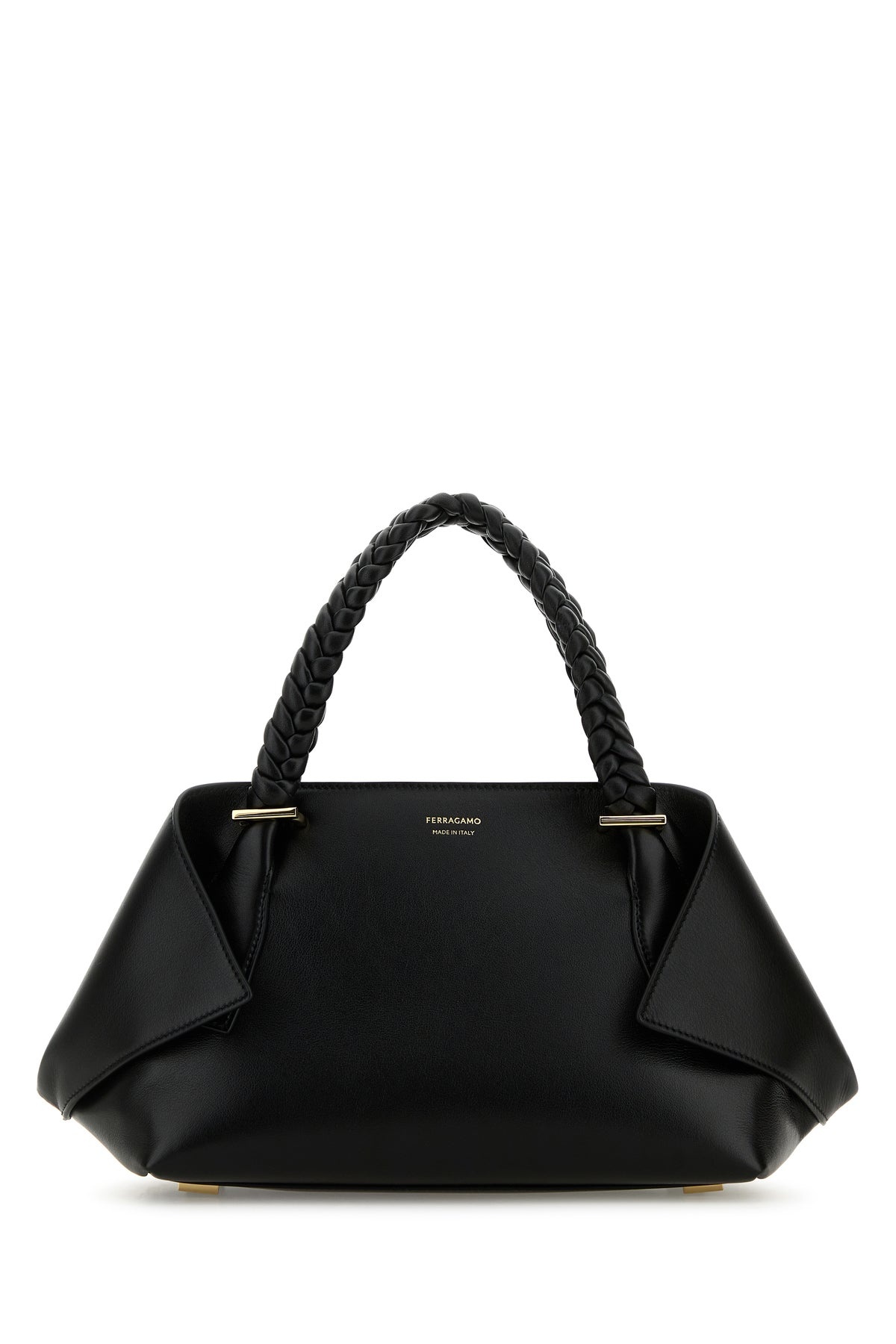 Handbag realized in smooth calf leather characterized by laminated printed logo at the front. - Two tonal woven leather handle - Adjustable detachable tonal leather shoulder strap - Zip closure - Lined interior - Protective metal feet at the base DETAILS Black leather medium handbag Exterior: 100% Calf Lining: 100% Leather Finishing: Platinum Made in italy Width: 36 cm Height: 21 cm Depth: 15 cm Handle height: 14 cm Min shoulder strap length: 49 cm Max shoulder strap length: 55 cm