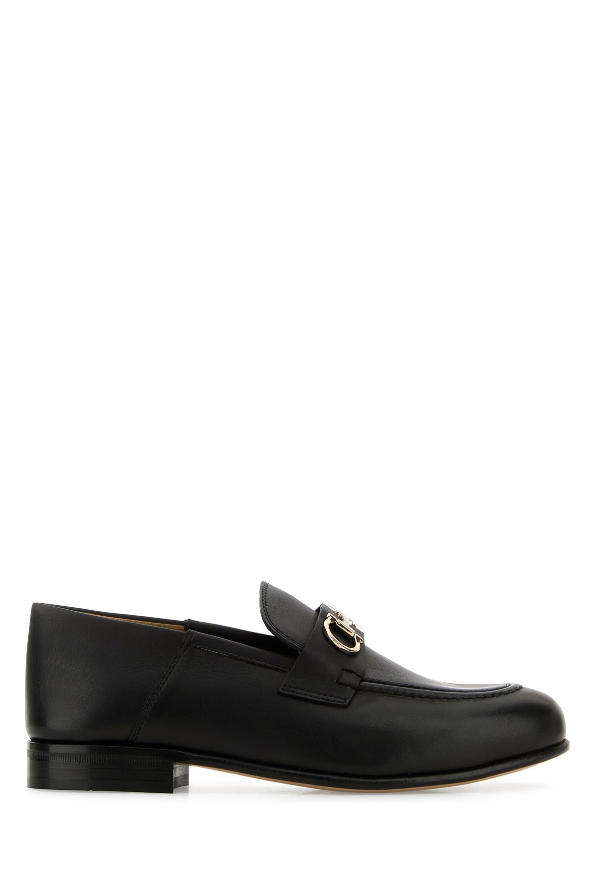 Loafers realized in smooth calf leather enriched by metal Gancini detail on the vamp. - Round toe - Embossed logo on the inside DETAILS Black leather Ottone loafers Exterior: 100% Calf Interior: 100% Leather Sole: Leather Made in italy