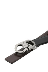 Reversibile belt realized in smooth calf leather characterized by Gancini buckle. - Press-stud closure - Contrasting interior DETAILS Black leather reversibile belt Exterior: 100% Calf Finishing: Silver metal Made in italy Height: 3,5 cm