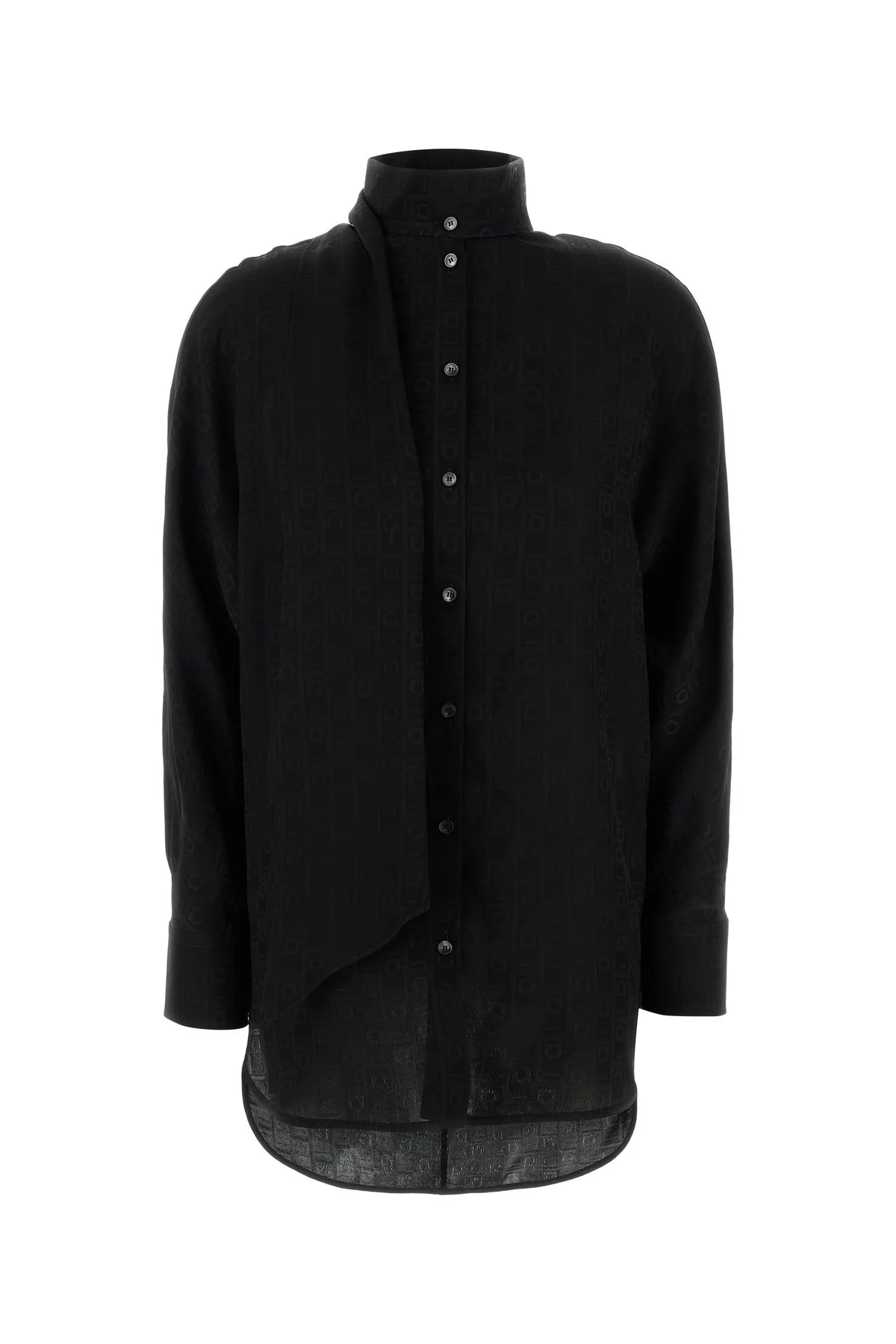 Shirt realized in pure silk characterized by tonal Gancini embroidery on the entire surface. - Scarf collar - Buttons closure - Angle cuffs with button - Lateral slits on the hemline - Loose fit DETAILS Black silk shirt Exterior: 100% Silk Made in italy Sample size: 40