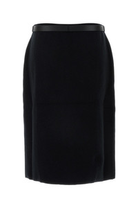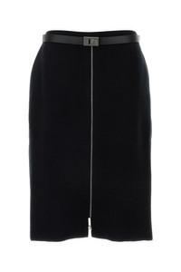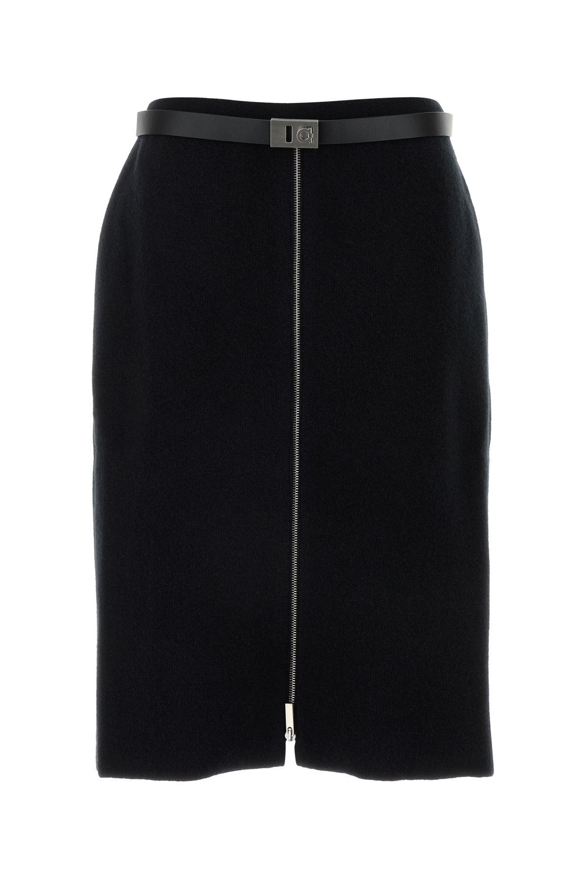 Midi-length skirt realized in stretch wool blend enriched by detachable leather belt with metal Gancini buckle. - Belt loops at the waist - Ribbed elastic waist - Zip closure at the front - Unlined DETAILS Black stretch wool blend skirt Exterior: 49% Virgin wool 31% Viscose 15% Polyester 4% Nylon 1% Elastane Made in italy Sample size: M