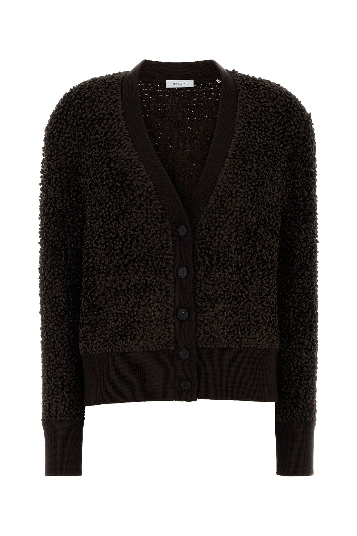 Cardigan realized in boucle. - V neckline - Buttons closure - Ribbed cuffs and hemline DETAILS Dark brown boucle cardigan Exterior: 81% Viscose 11% Cotton 8% Polyester Made in italy Sample size: XS