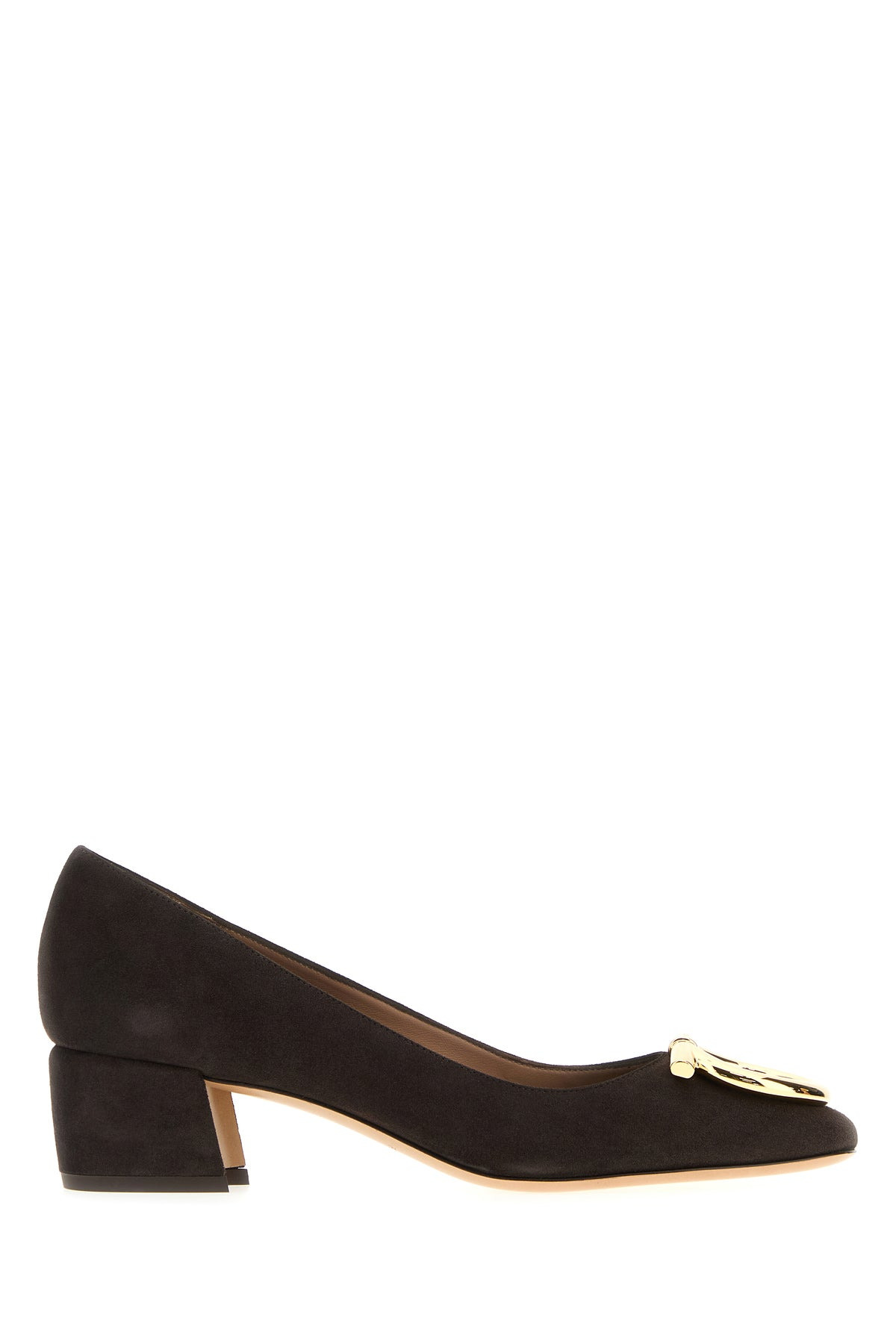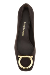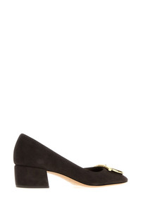 Pumps realized in suede enriched by metal Gancini detail at the front. - Squared toe - Printed logo on the inside - Low heel DETAILS Dark brown suede Mara pumps Exterior: 100% Suede Interior: 100% Leather Sole: Leather Made in italy Heel height: 4 cm