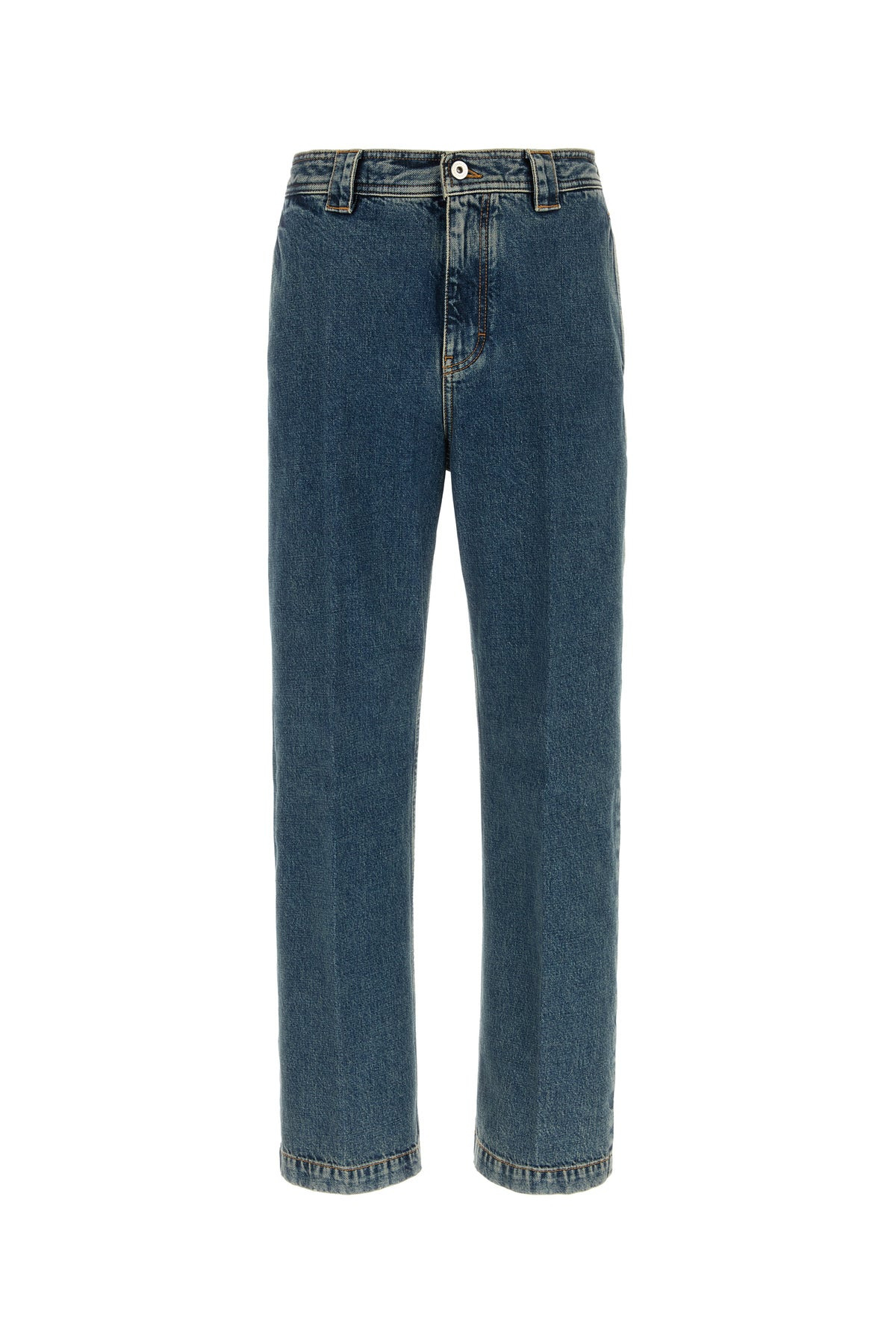 Jeans realized in stonewashed pure cotton denim enriched by leather logoed label at the back. - Belt loops at the waist - Concealed zip and a single visible button closure - Seam pockets and two patch pockets at the back DETAILS Denim jeans Exterior: 100% Cotton Made in italy Model is 190 cm and is wearing a size 48